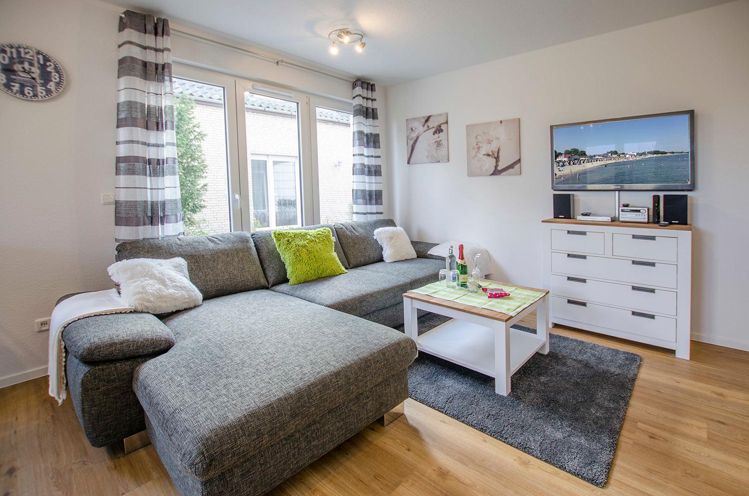 Das Wohnzimmer ist liebevoll und mordern für die Feriengäste eingerichtet worden. Eine gemütliche Eckcouch mit Schlafffunktion lädt zum Entspannen ein, für die Unterhaltung stehen Ihnen Flachbild-TV, eine kleine Stereoanlage sowie Internetzugang zur Verfügung.