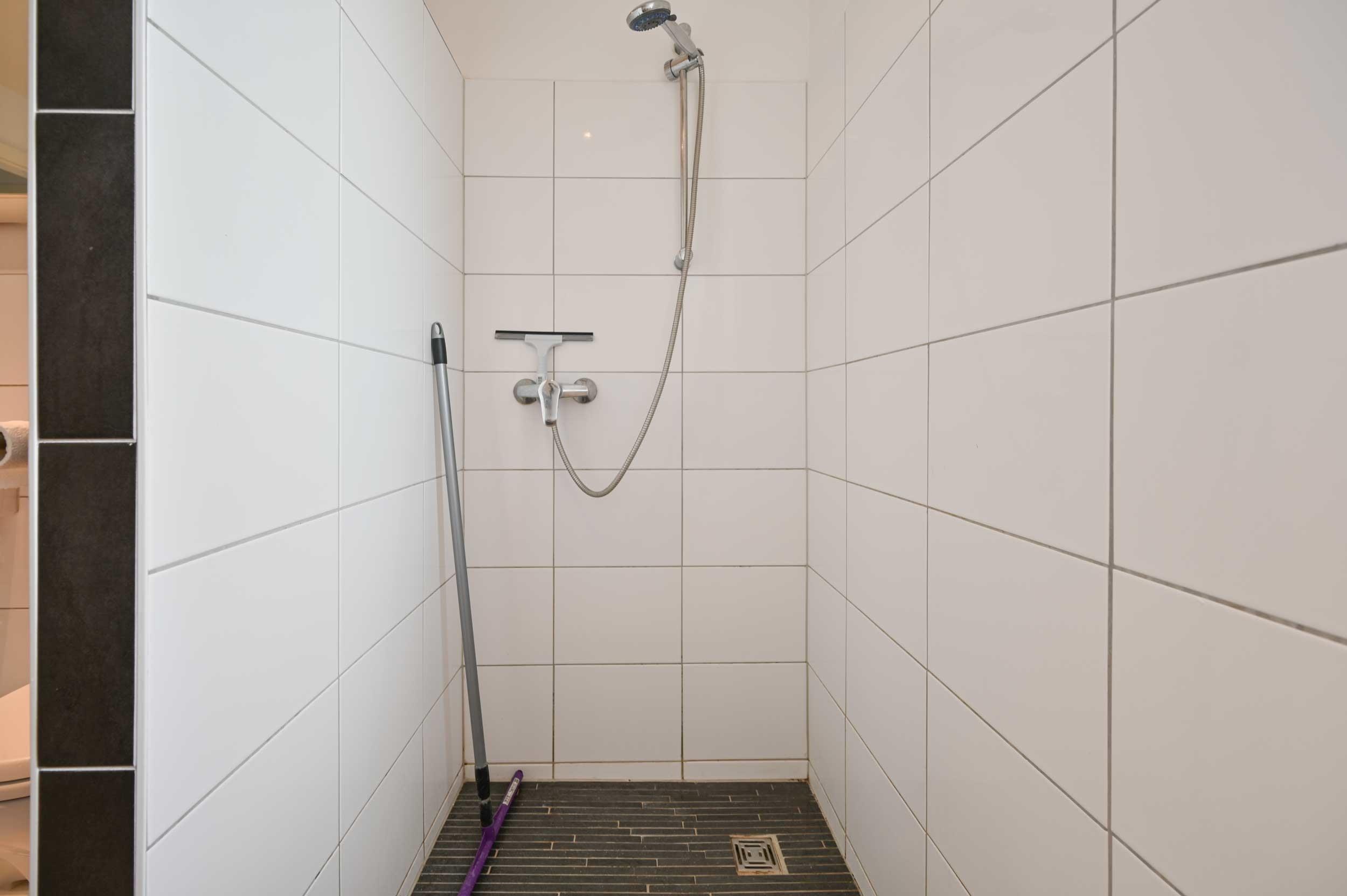 Duschbad mit WC und Waschmaschine.