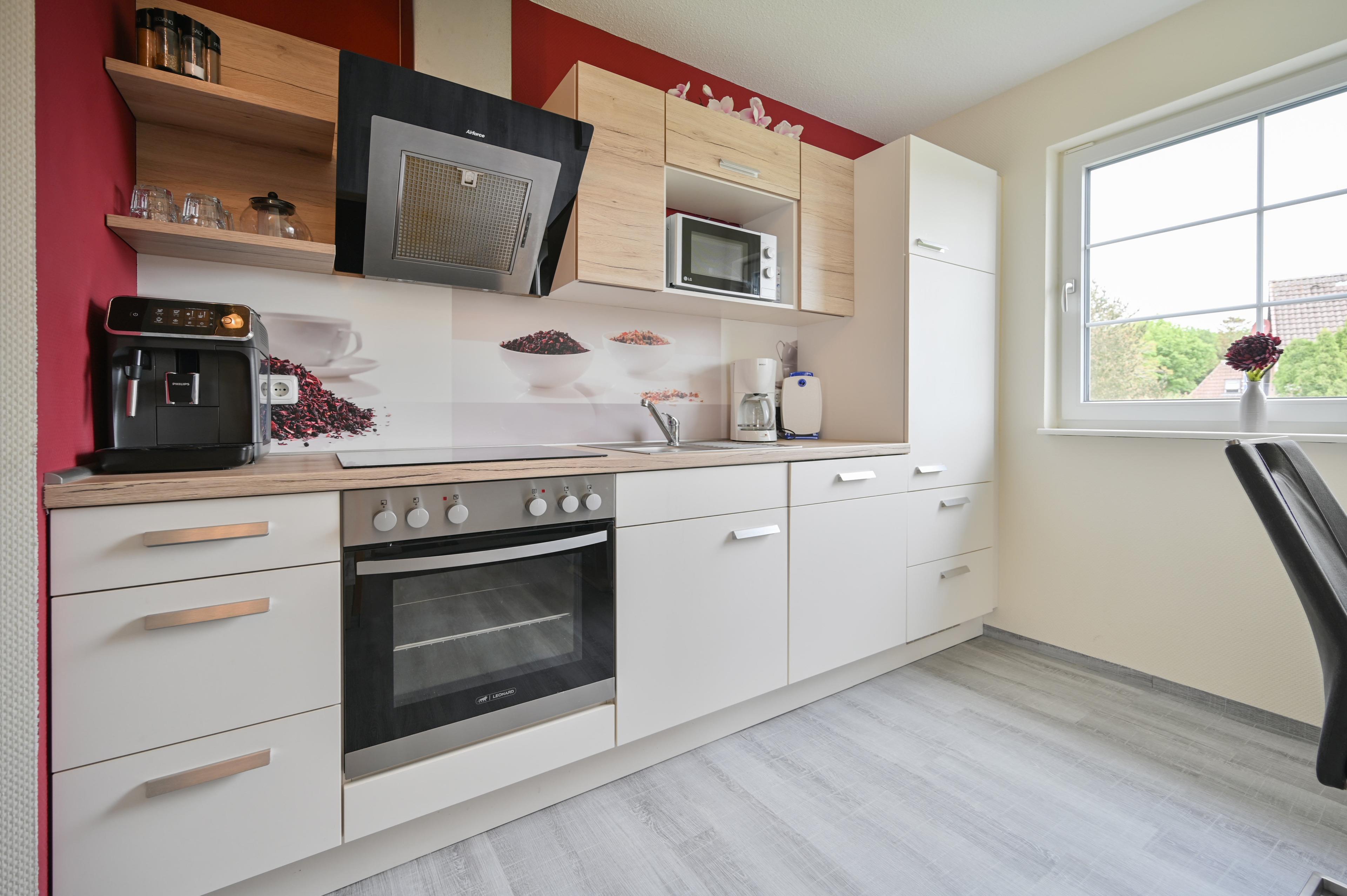 Die "Ferienwohnung meine mittlere Auszeit" liegt im Obergeschoss auf der rechten Seite. Der Garderobenbereich verfügt über ein Schuhregal und grenzt direkt an die offene Küche an, welche zur Saison 2017 neueingebaut worden ist. Die Küche verfügt über einen Backofen, ein Ceranfeld sowie eine Spülmaschine und einen Kaffeevollautomaten. Ebenfalls befindet sich ein Essplatz für zwei Personen im Küchenbereich.