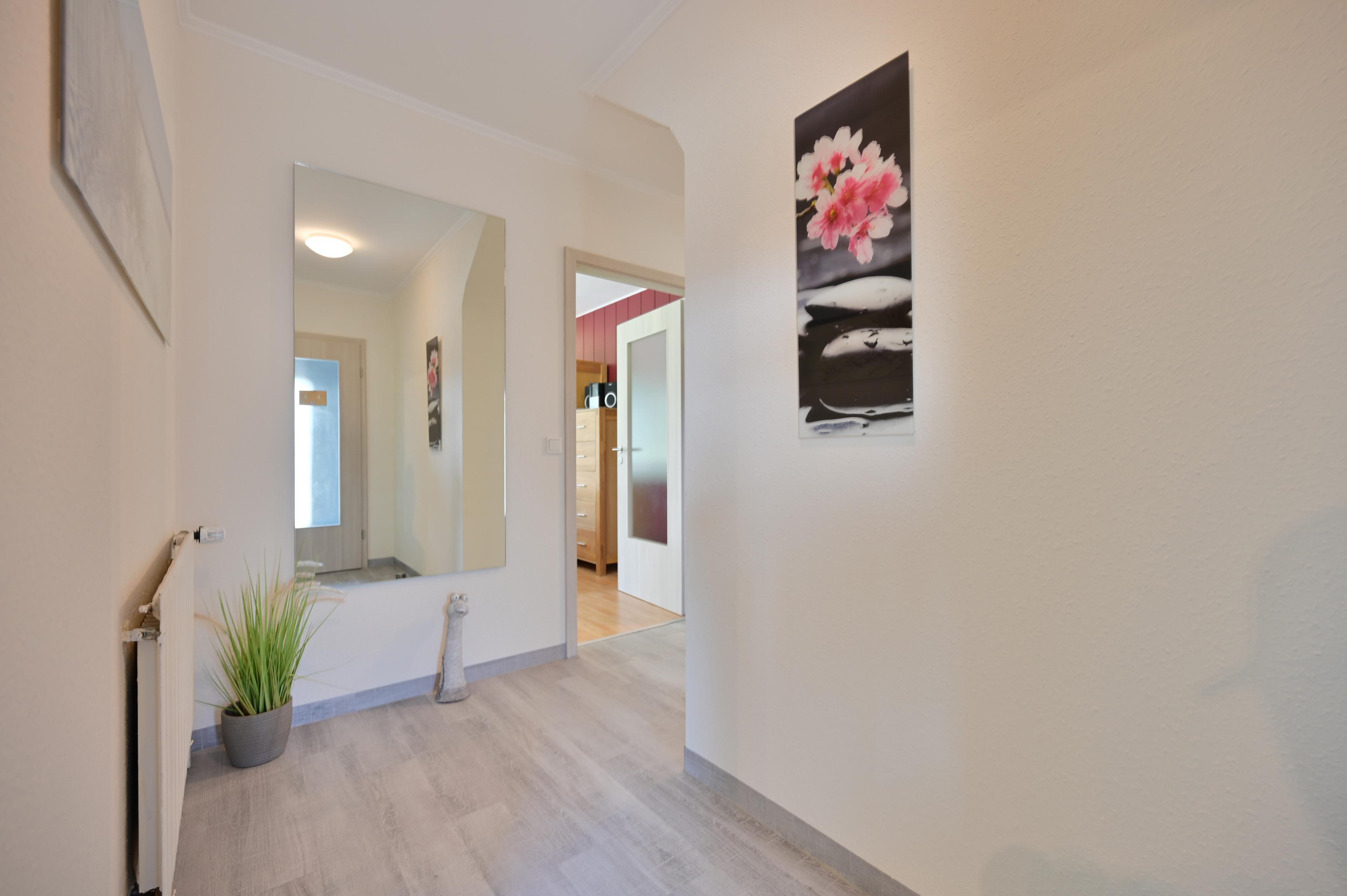 Der Eingangsbereich verfügt über einen Garderobenbereich mit Schlüsselkasten und verbindet die Wohnräume mittels eines Flurs.