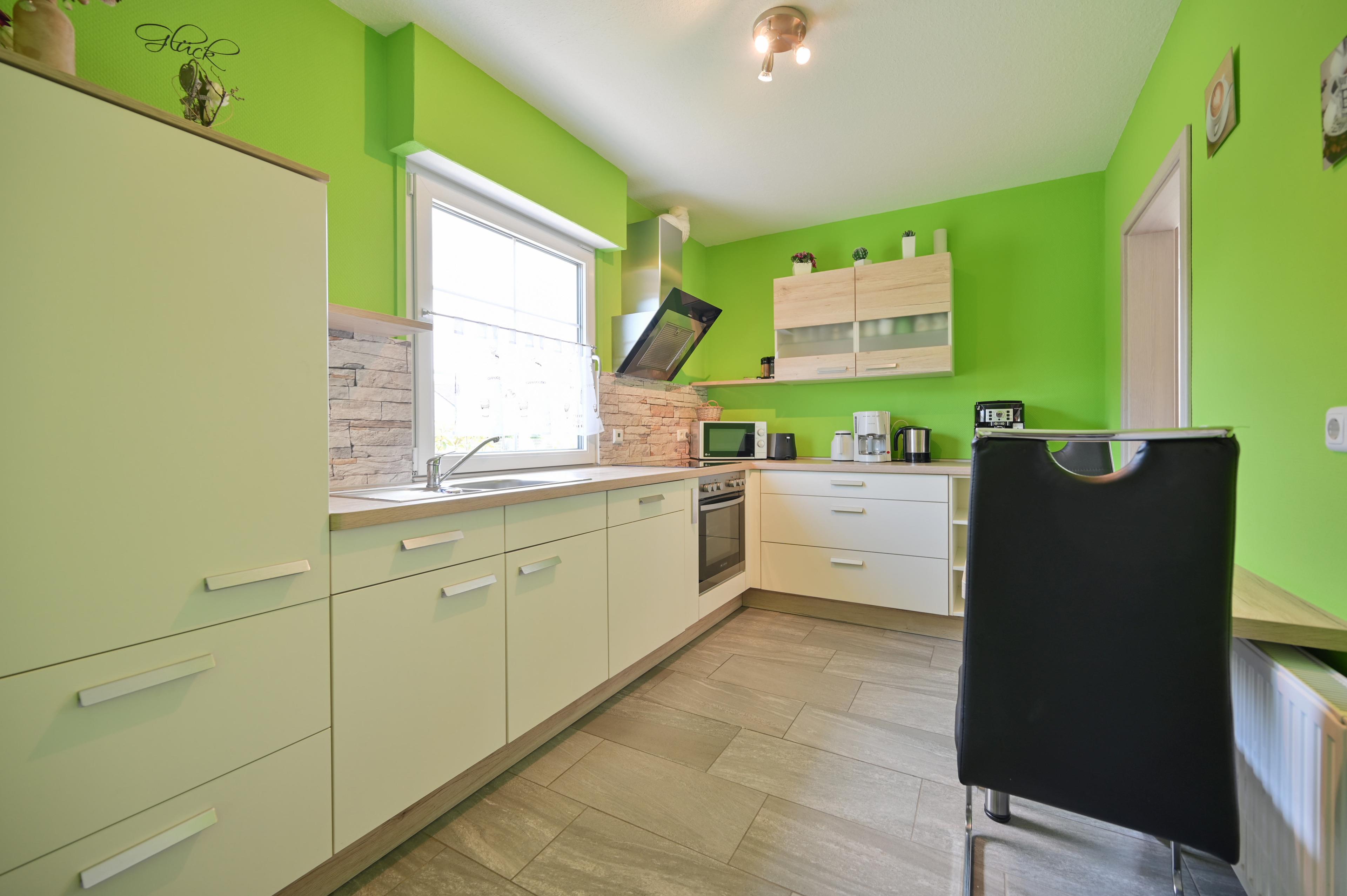 Die separate neue Küche verfügt über einen Backofen, ein Ceranfeld sowie eine Spülmaschine und einen Kaffeevollautomaten. Ebenfalls befindet sich ein Essplatz für zwei Personen im Küchenbereich.