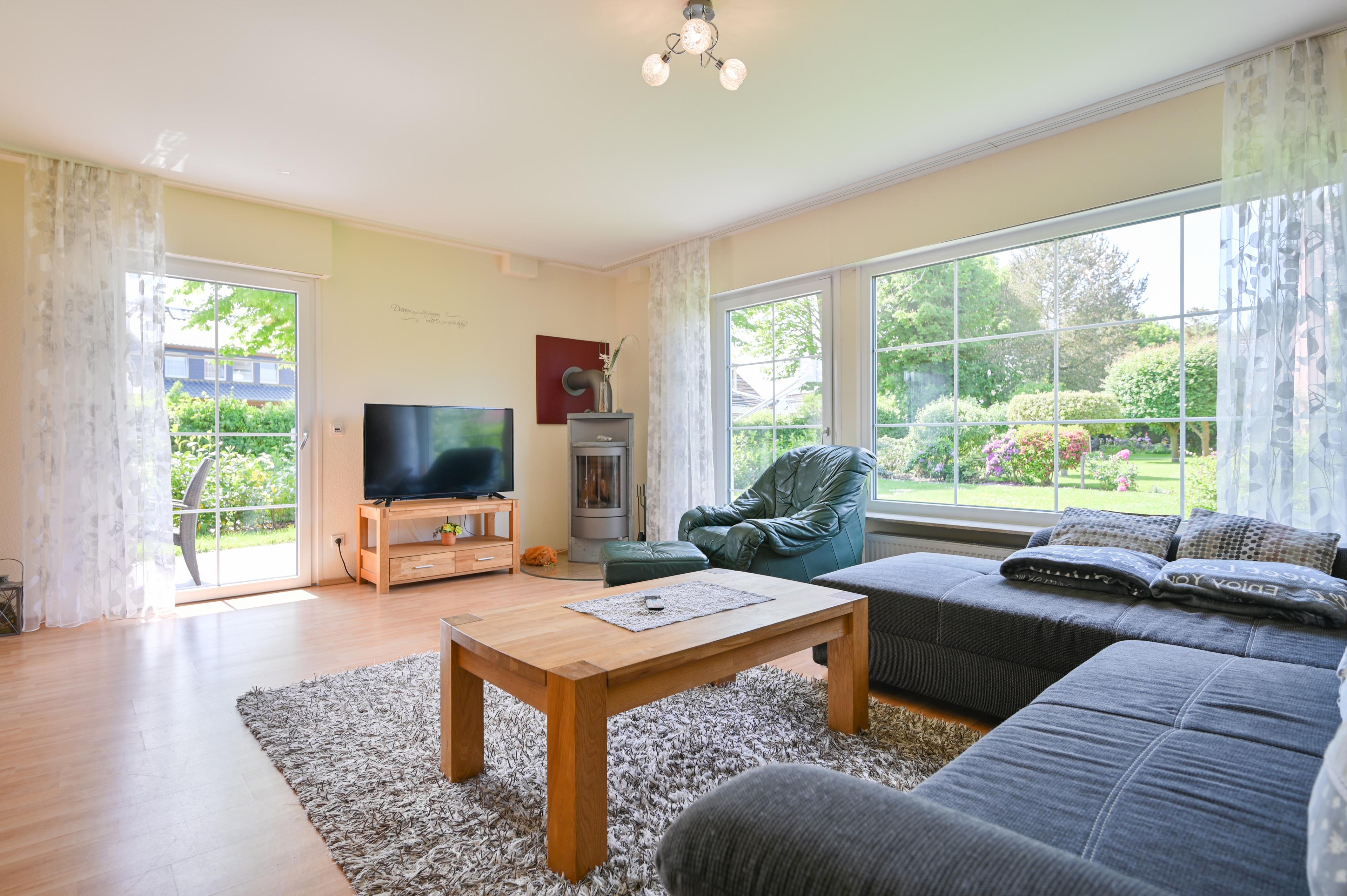Das angrenzende Wohnesszimmer verfügt über ein Essbereich für bis zu sechs Personen. Das Wohnzimmer über eine geräumige Schrankwand und einen Couchbereich mit Tisch und Flachbild-TV. Von hieraus besteht die Möglichkeit auf den Terrassenbereich mit Grill und Gartenmöbel sowie in den Garten zu gelangen.