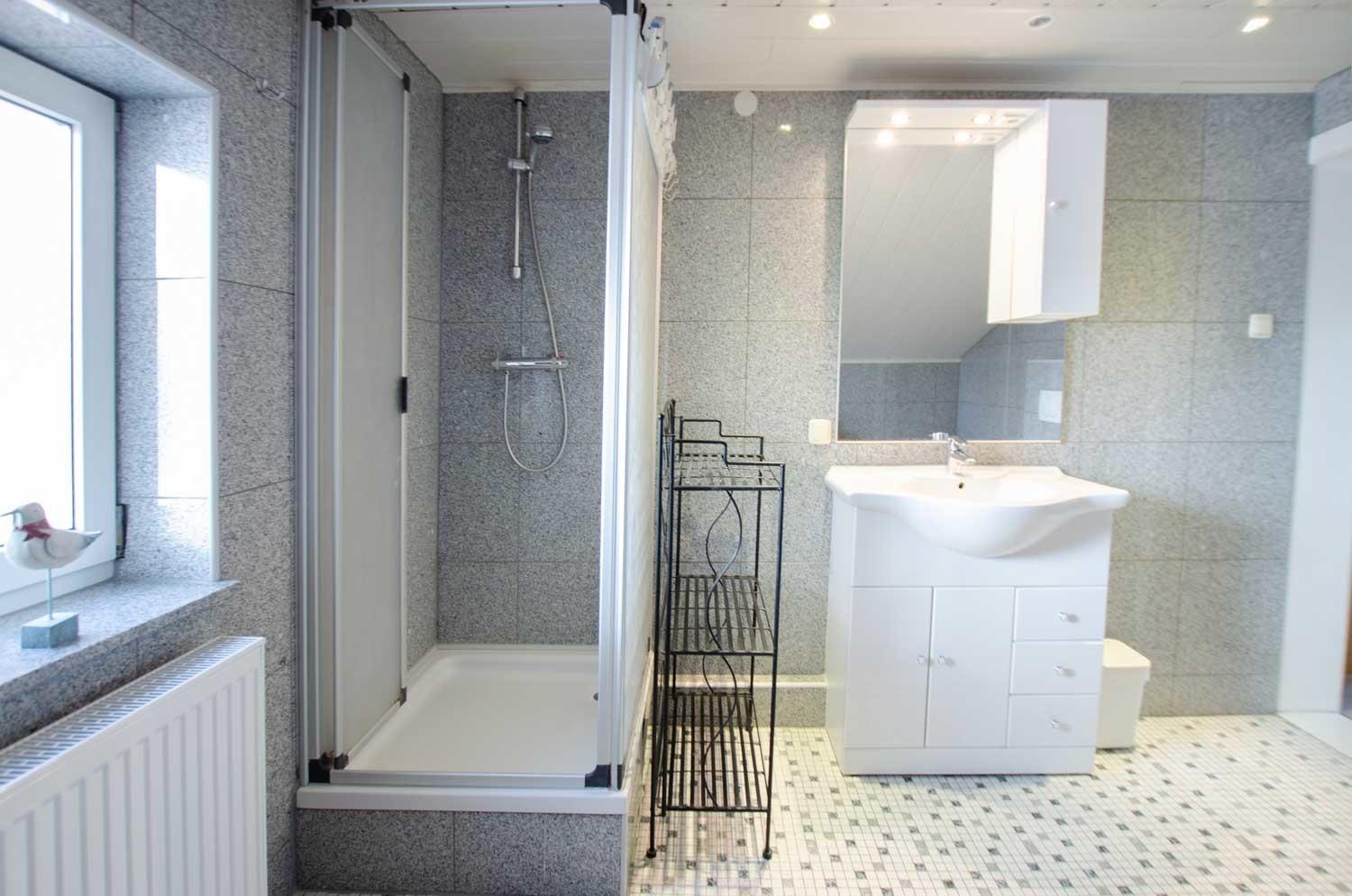 Das Badezimmer ist groß und verfügt neben Dusche auch eine Badewanne.