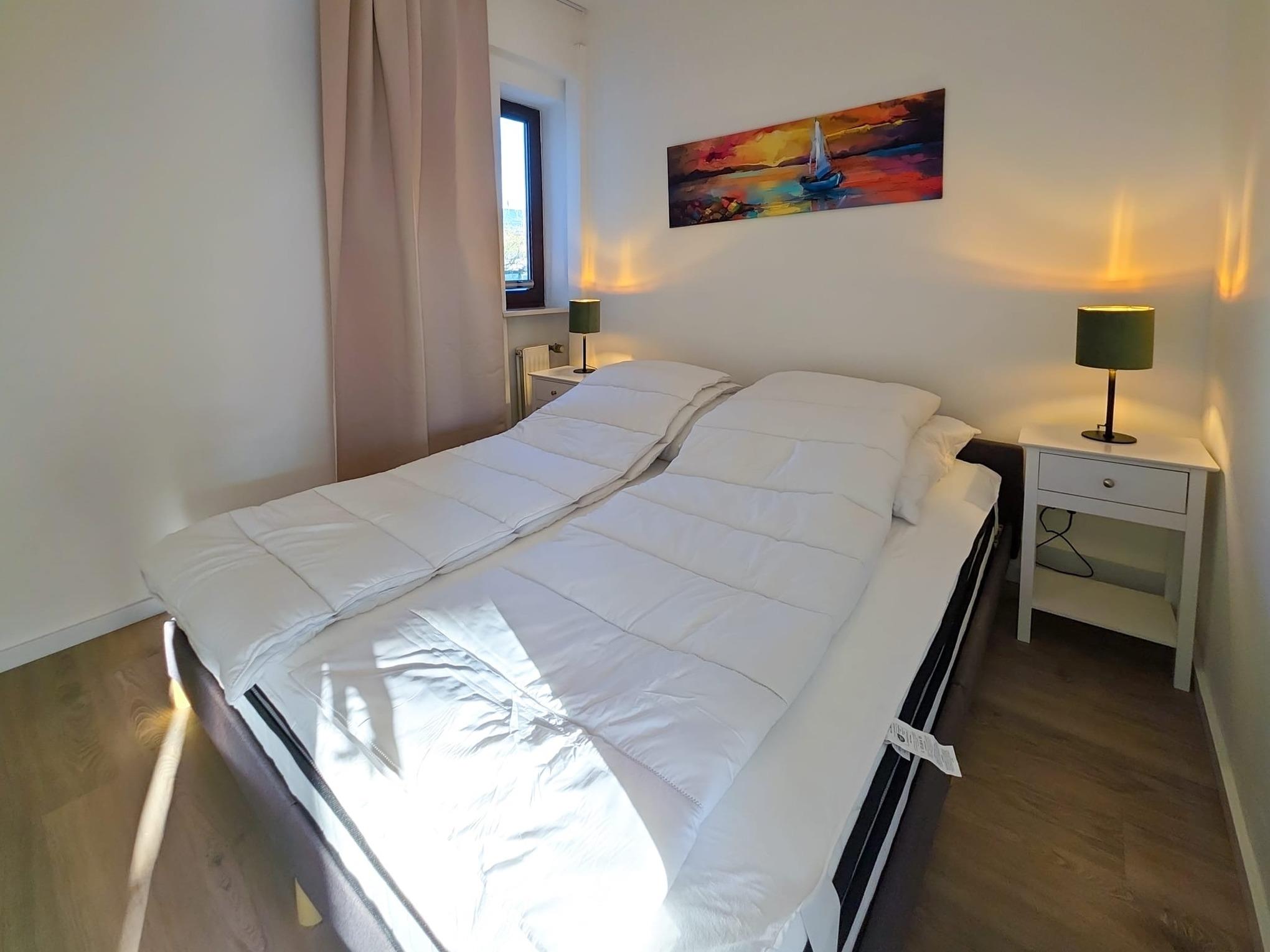 Im zweiten separaten Schlafzimmer finden Gäste ein Doppelbett mit Nachttischen und Lämpchen, Kleiderschrank und Spiegel. Zudem verfügt die Ferienwohnung über eine separate Küchenzeile und ein Bad mit Dusche und WC.