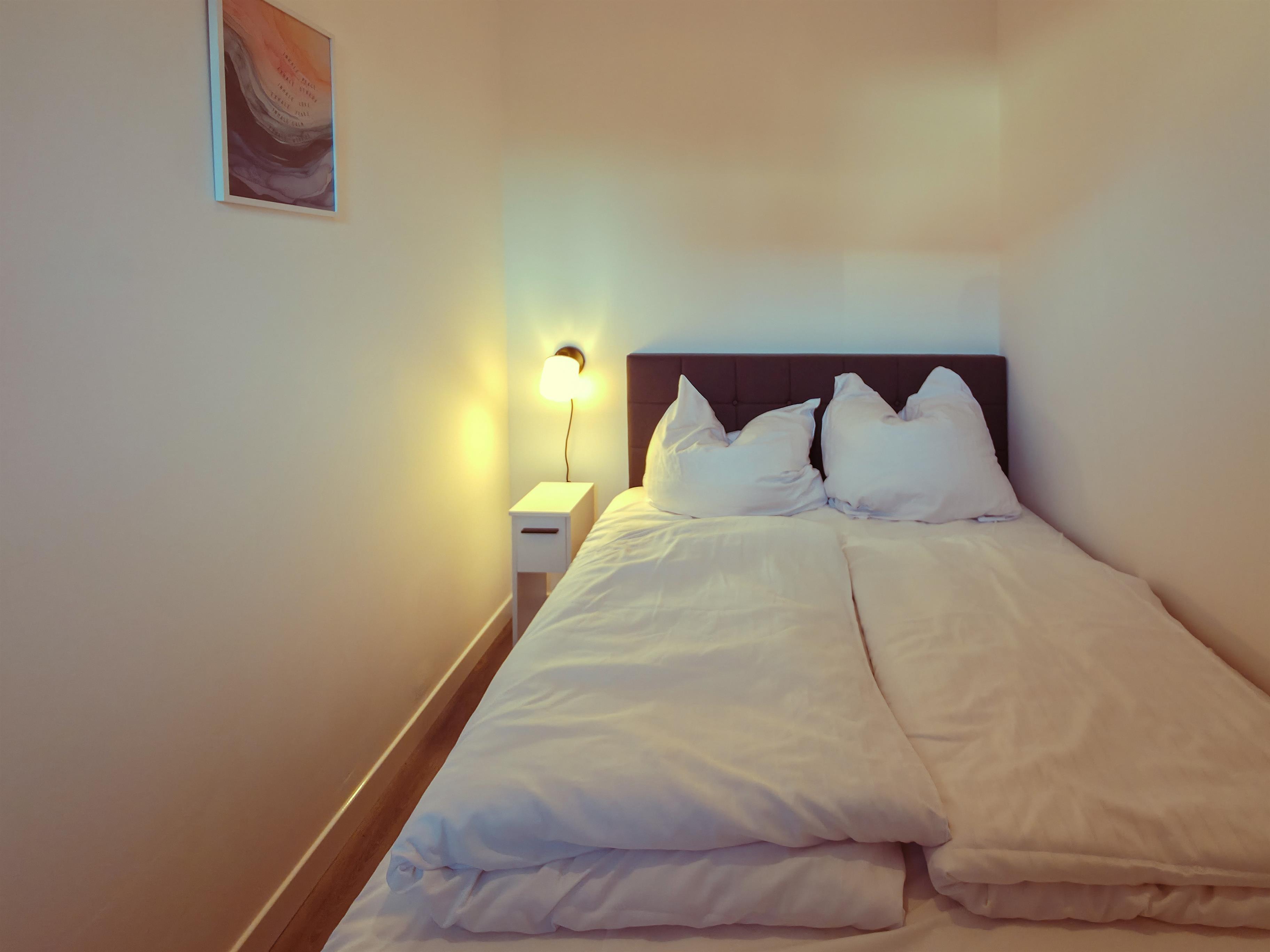 Besucher finden zudem ein separates, (kleines) Schlafzimmer mit zwei Einzelbetten und einer Kommode mit Schubladen sowie zwei Nachttischen mit Lampe vor.