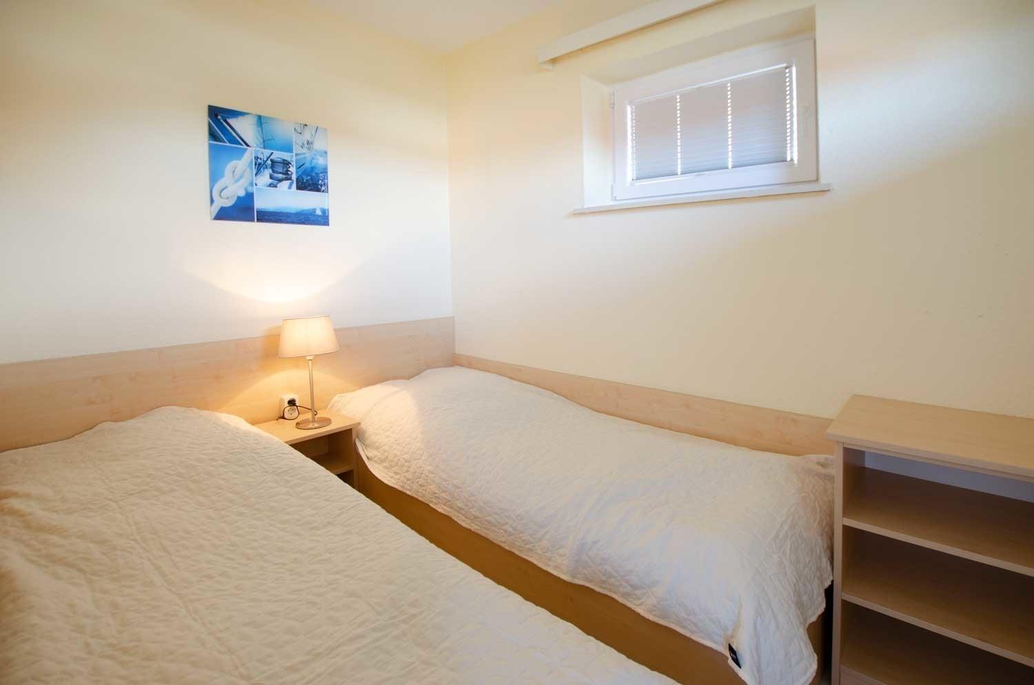 Besucher finden zudem ein separates, "kleines" Schlafzimmer mit zwei Einzelbetten und einer Kommode mit Schubladen sowie zwei Nachttischen mit Lampe vor.