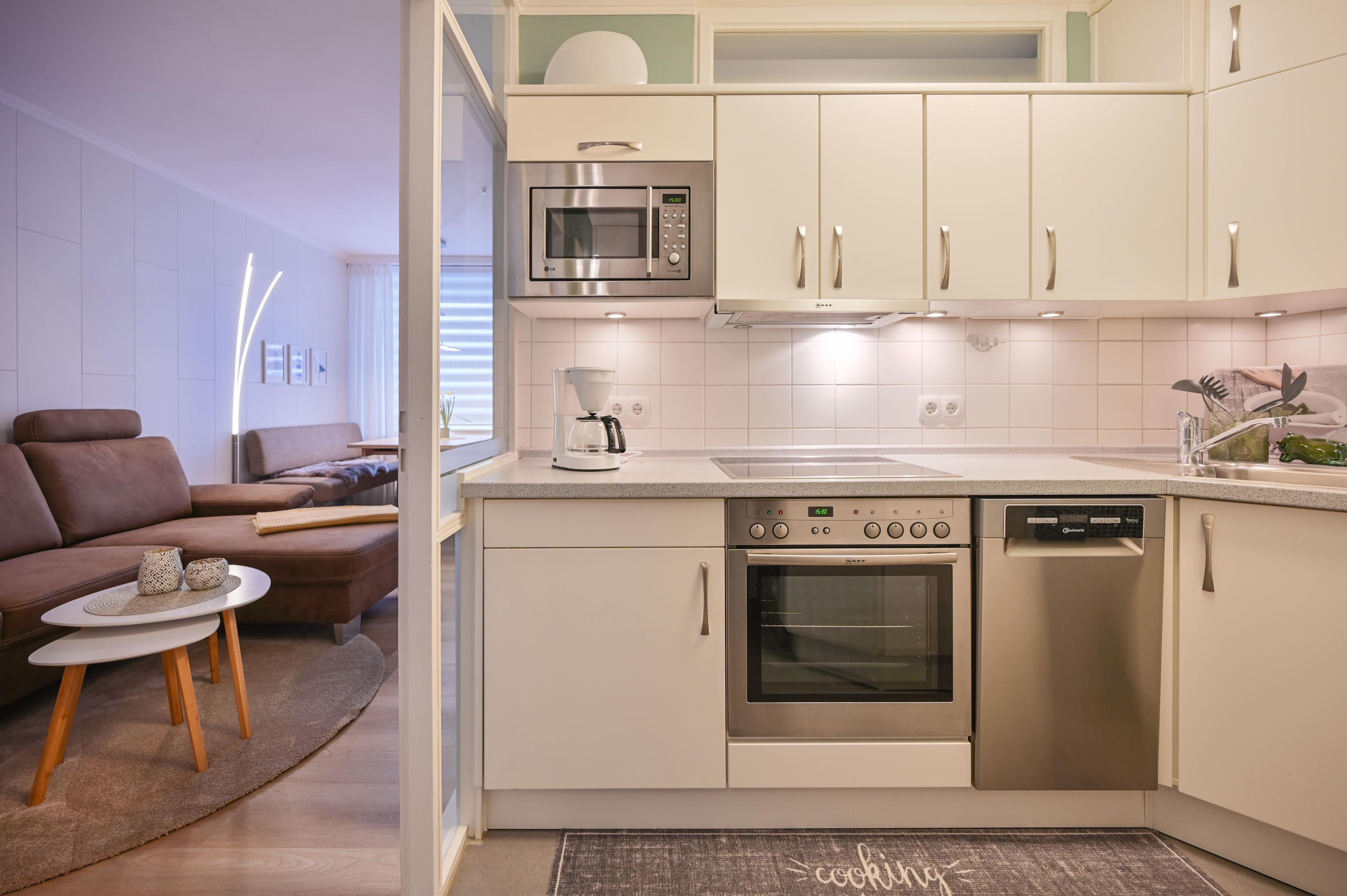 In der hochwertigen Einbauküche mit Cerankochfeld, Backofen, Spülmaschine und Mikrowelle fehlt es an nichts. Vom Kühlschrank mit Gefrierefach über die Kaffeemaschine bis zum Eier - und Wasserkocher ist alles vorhanden.