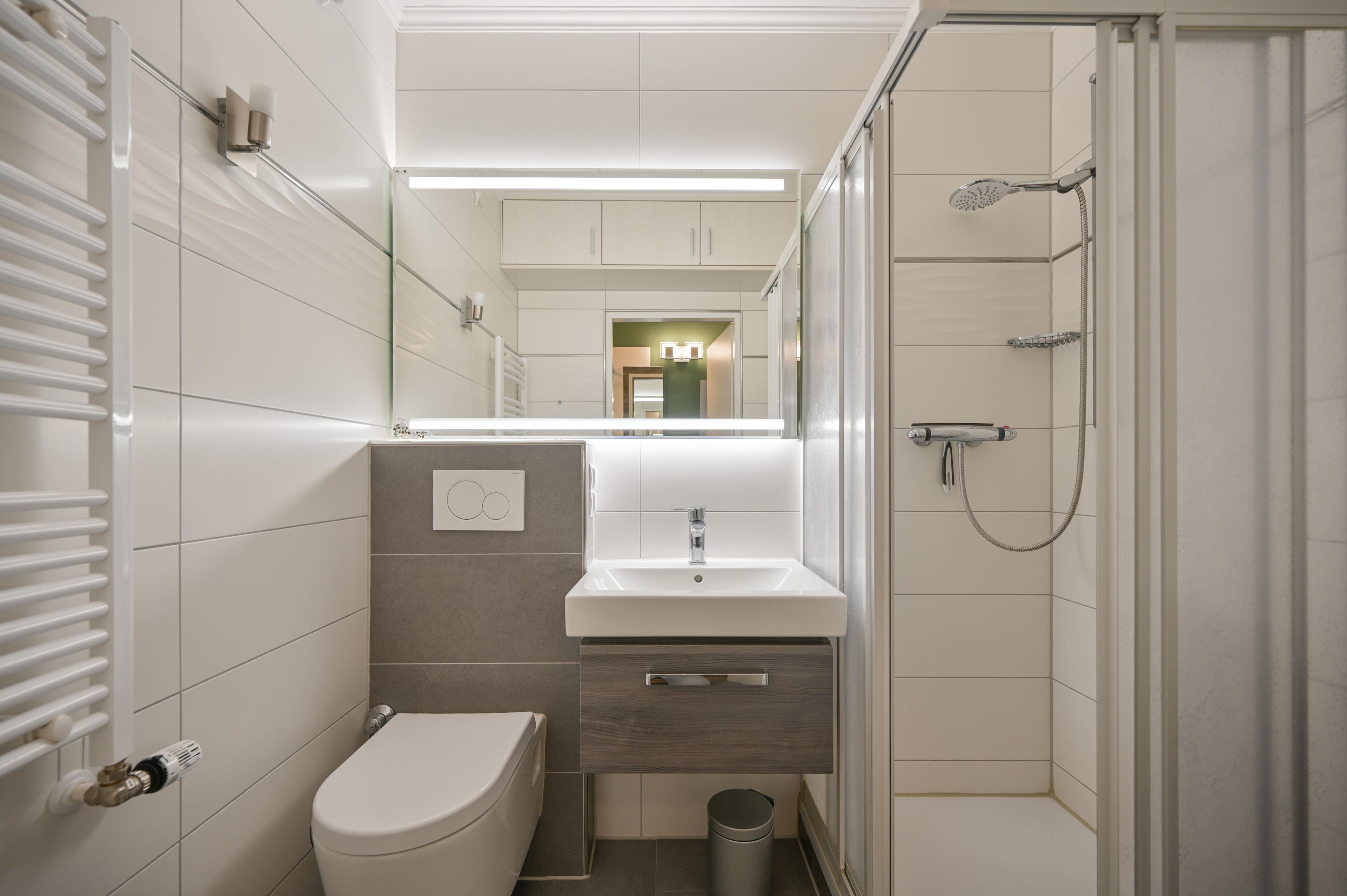 Das Badezimmer ist mit einer Dusche mit besonders niedrigem Einstieg ausgestattet.