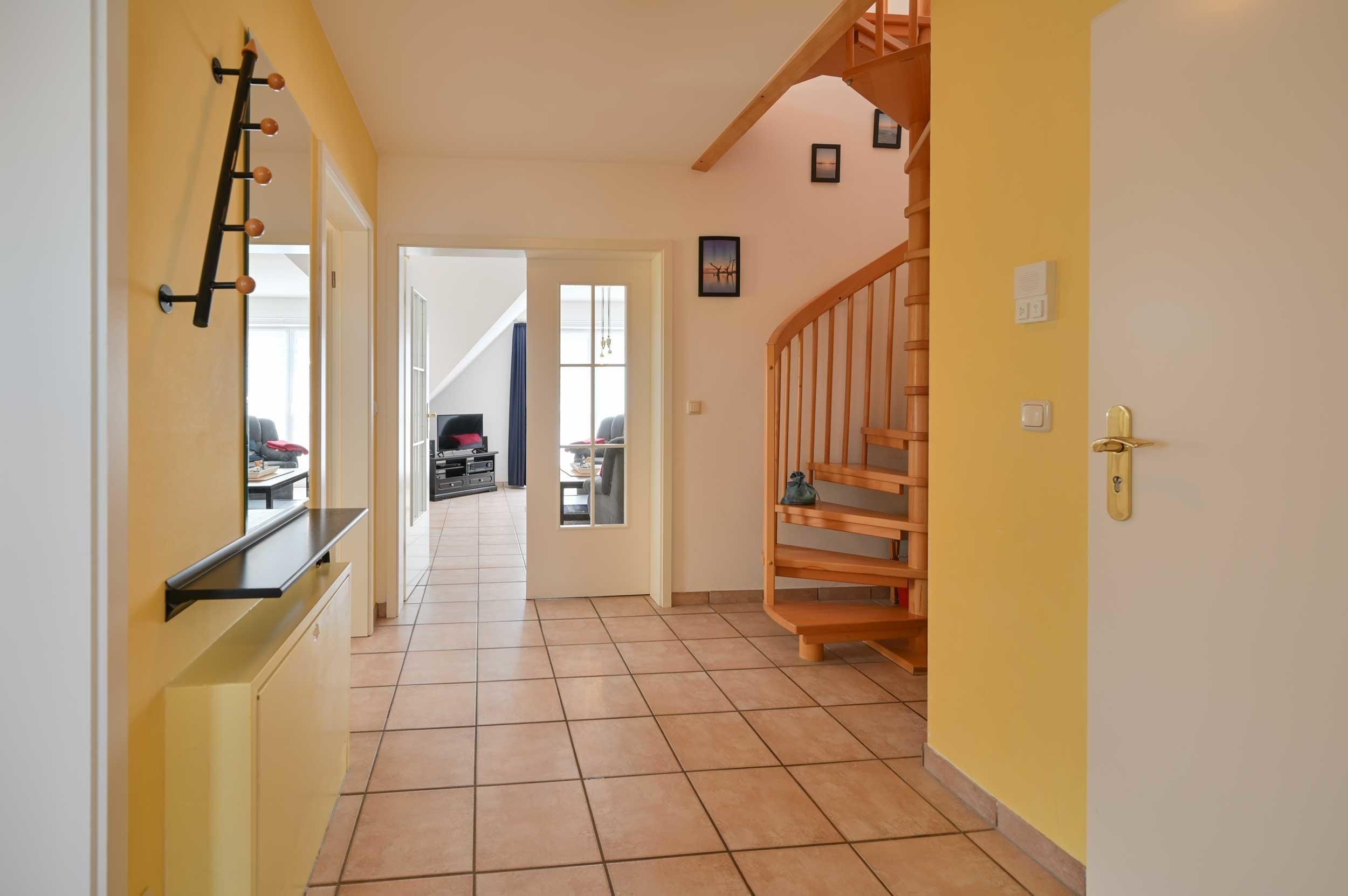 Die Ferienwohnung verfügt über ein Schlafzimmer mit Doppelbett (1,80 m x 2,00 m), Nachtschränken und großem Kleiderschrank mit Spiegel, über ein Badezimmer mit Dusche und WC und einen geräumigen Flur mit Garderoben, Spiegel und Wendeltreppe ins zweite Obergeschoss. Durch eine große, doppelflügelige Glastür gelangt man durch den Flur ins Wohnzimmer.