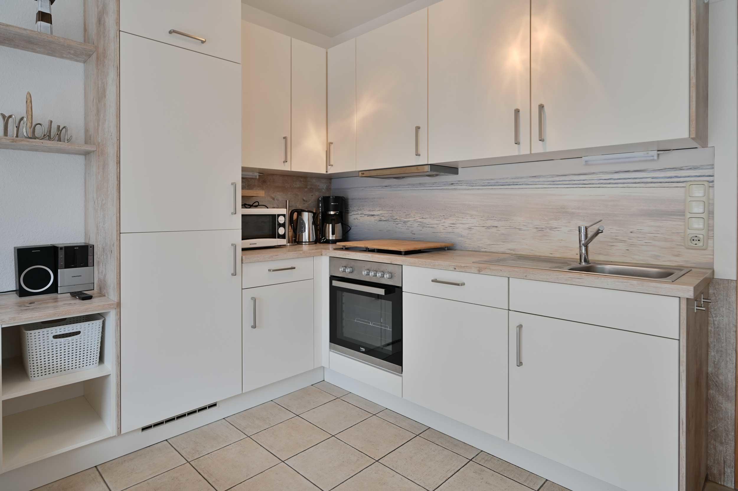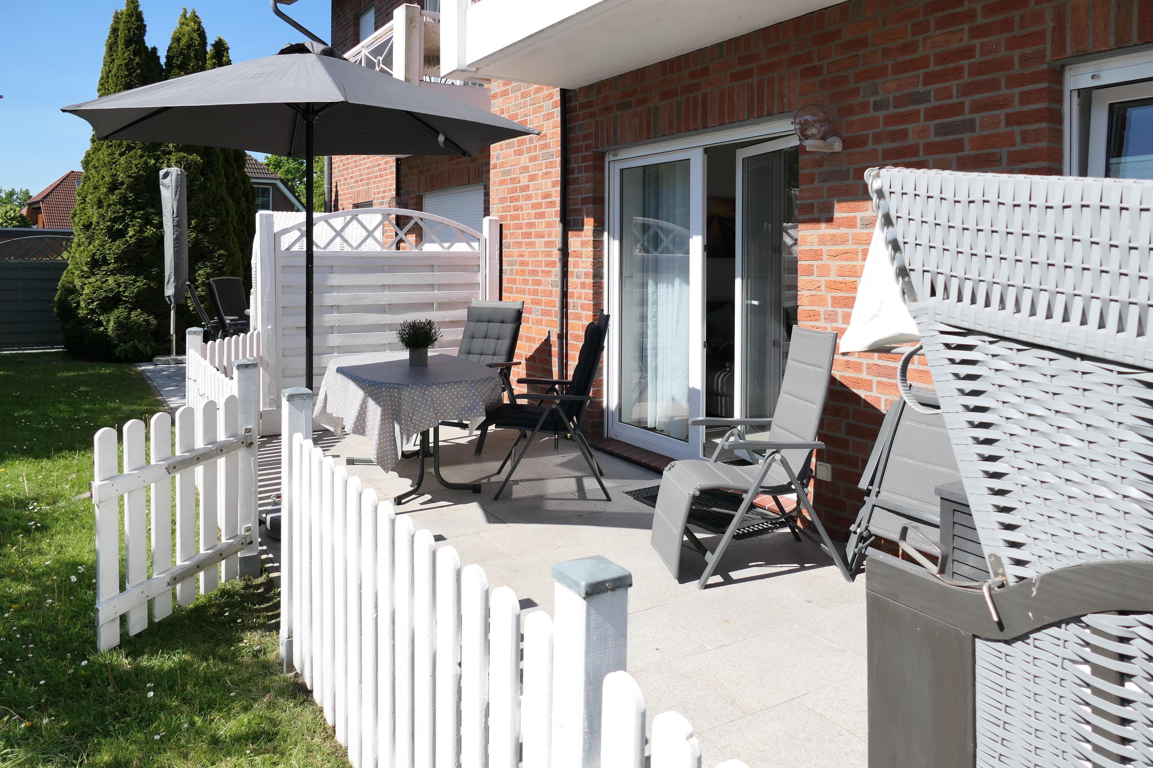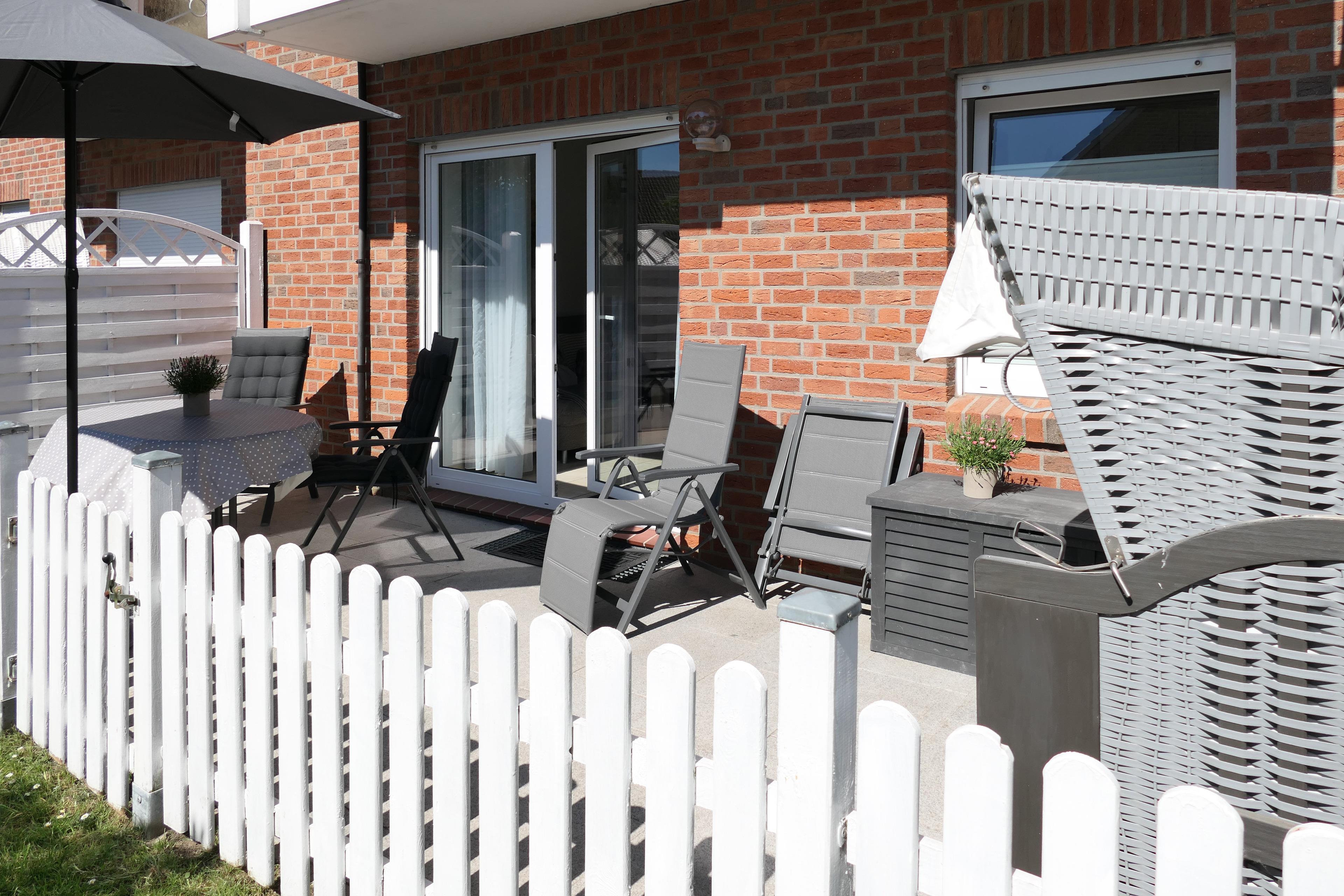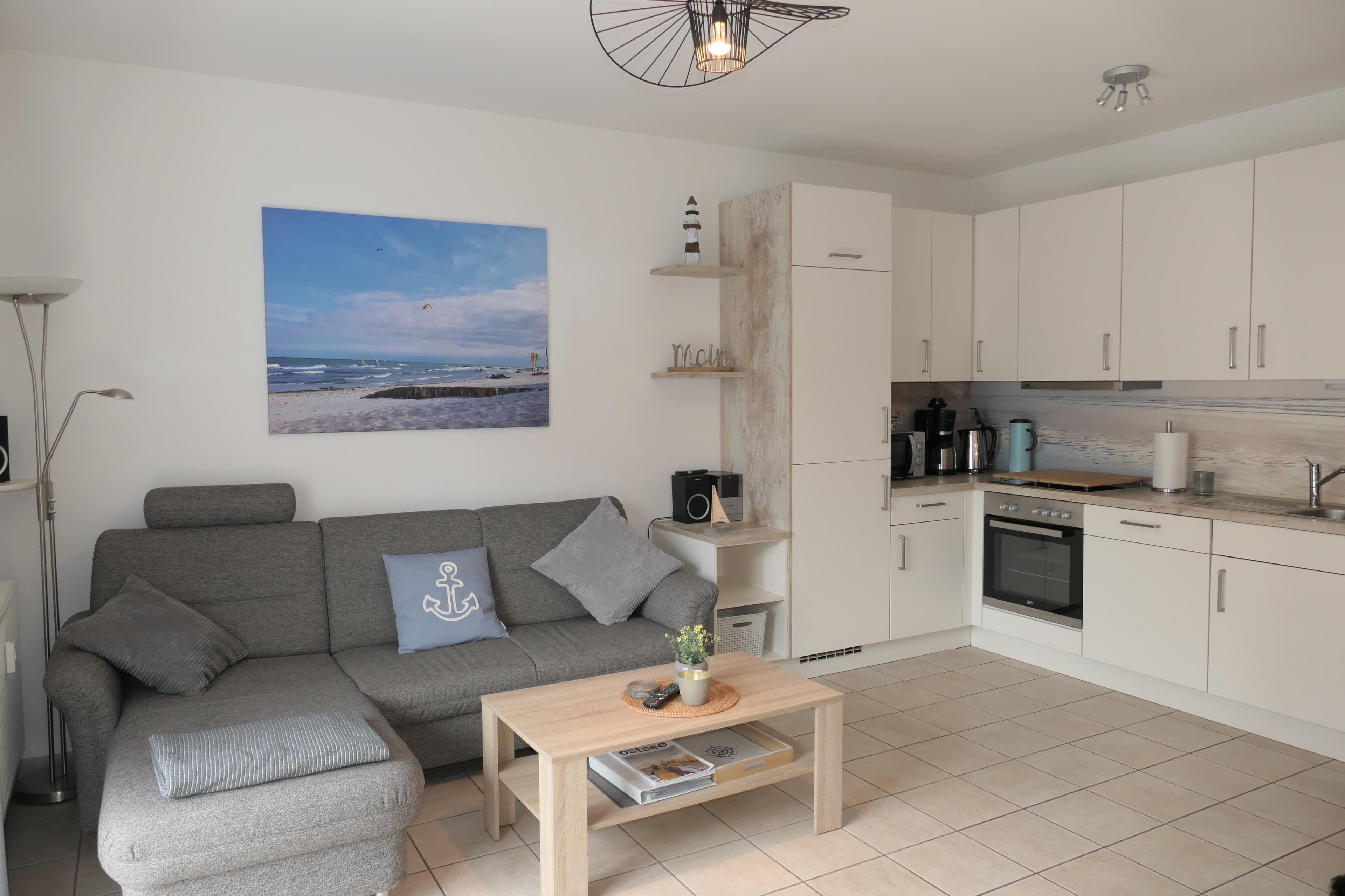 Die gemütliche Fewo verfügt über ein Wohnzimmer mit Essbereich, integrierter Küchenzeile, Flachbildfernseher und Zugang zur 12 m² großen Terrasse mit eigenem Strandkorb und Terrassenmöbeln.