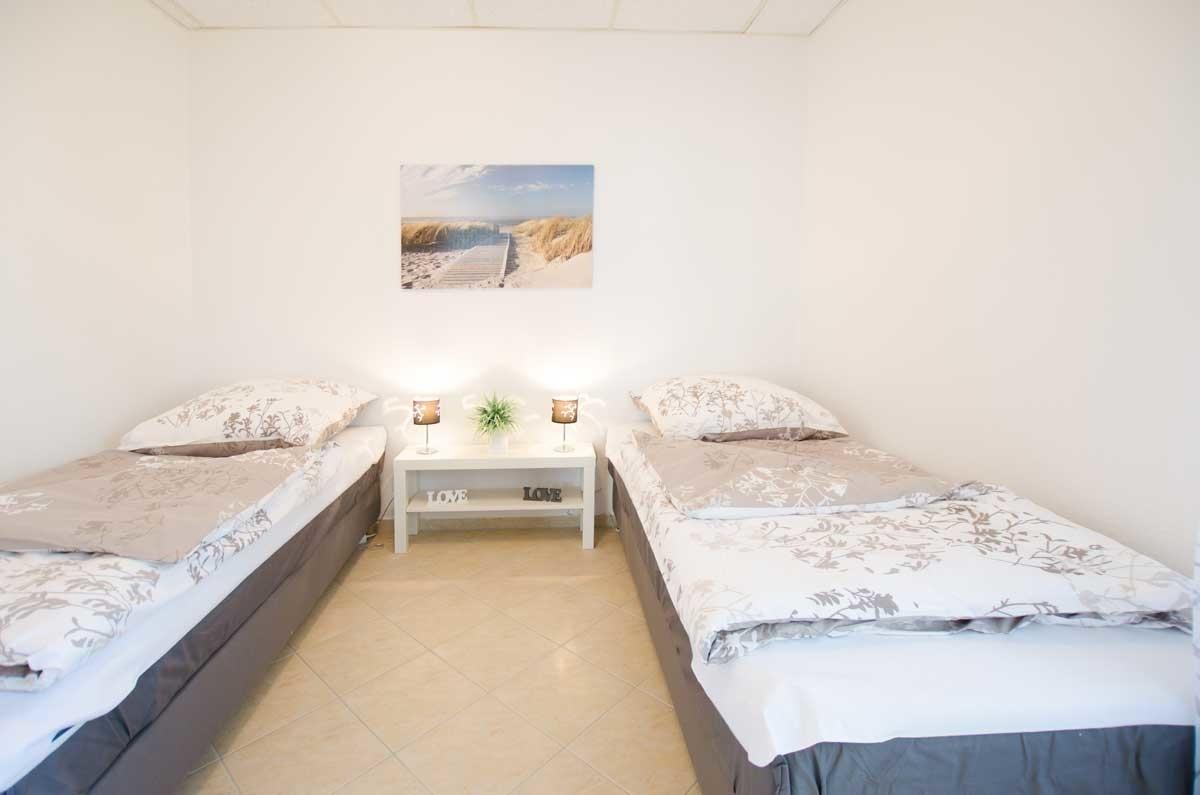 Das Schlafzimmer verfügt über 2 Boxspringbetten (90cm x 200cm / 55cm Höhe) und ein Fenster mit Außenrollladen.