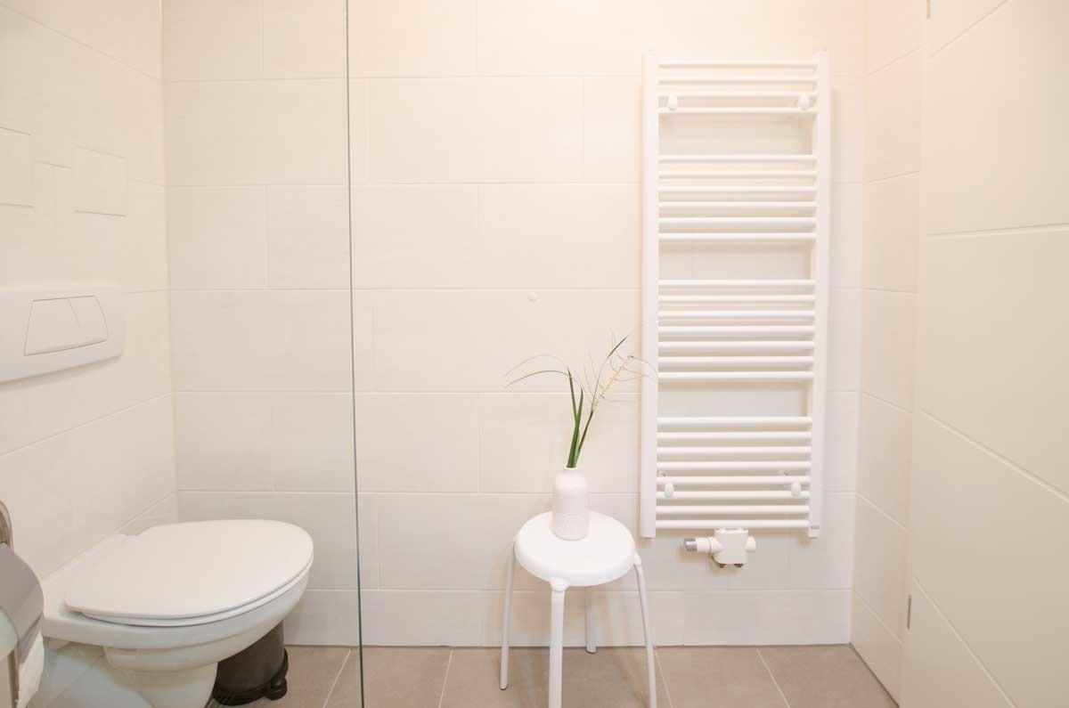 Zudem gehört zur Fewo ein Badezimmer mit großer, ebenerdiger (1 Meter x 1 Meter) Regendusche, Spiegelschrank, erhöhtem WC und einem Handtuchwärmer sowie ein Flur mit Spiegel und Garderobe.