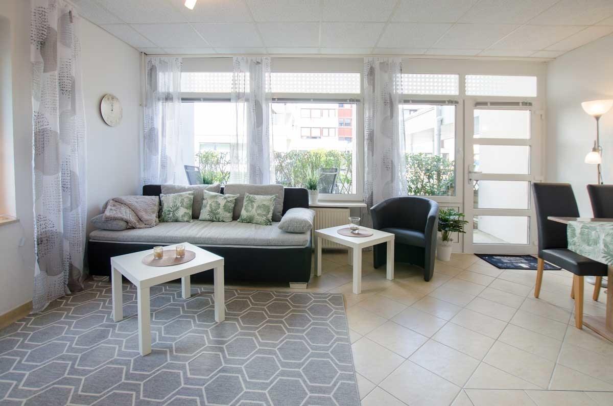 Die wunderschöne, renovierte, helle, barrierrefreie Ferienwohnung verfügt über ein Wohnzimmer mit Schlafsofa (160 x 200 cm "durchgehende Topper-Matratze"), großem Flachbildschirm - Diagonale 125cm -, Einbauküche mit 4 Platten-Ceranfeld und Zugang zur großen, überdachten, möblierten Terrasse.
