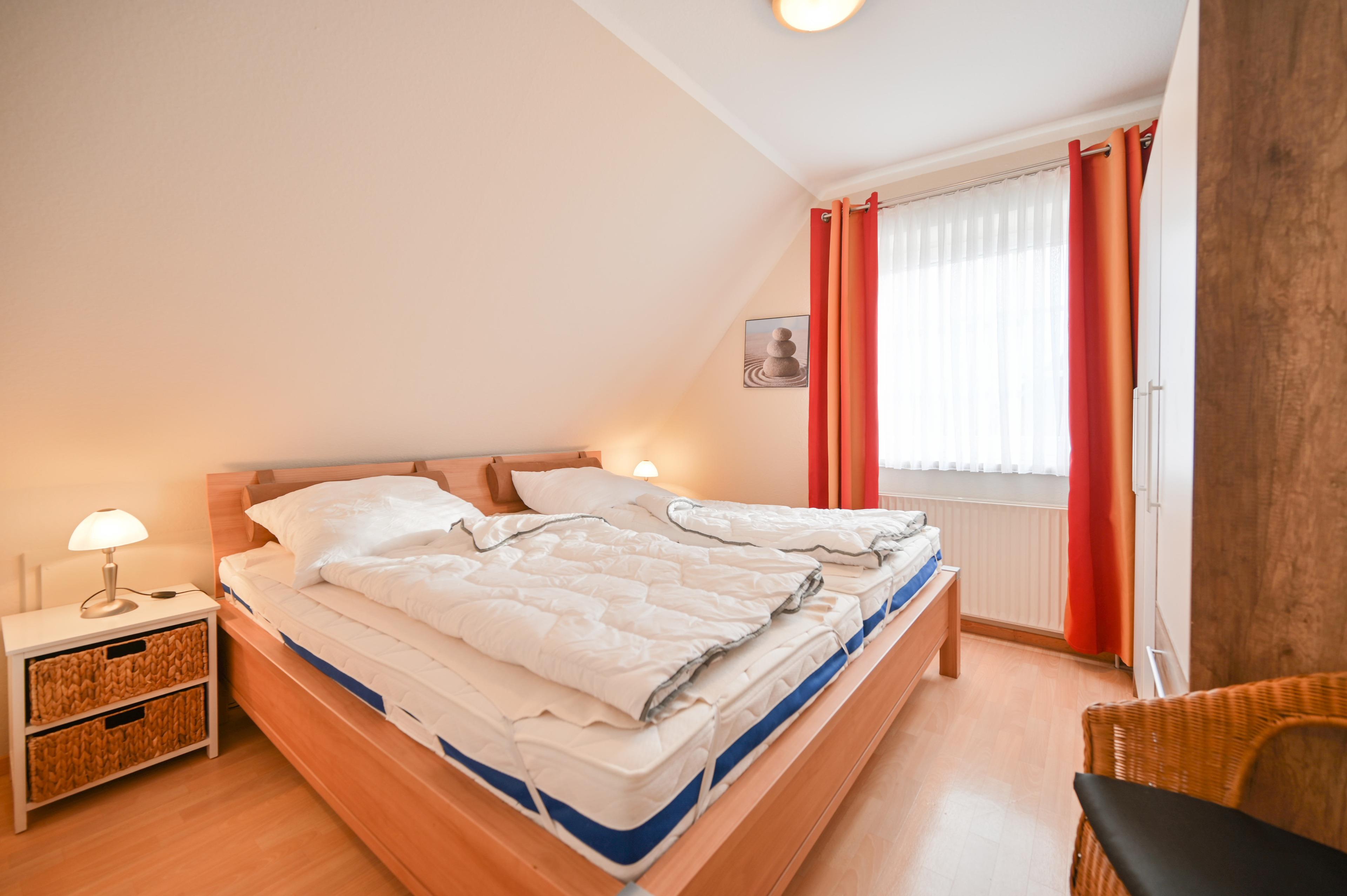 Im Schlafzimmer ist ein Doppelbett (200 x 200 cm), zwei Nachtschränkchen mit Lesebeleuchtung und ein Kleiderschrank.
