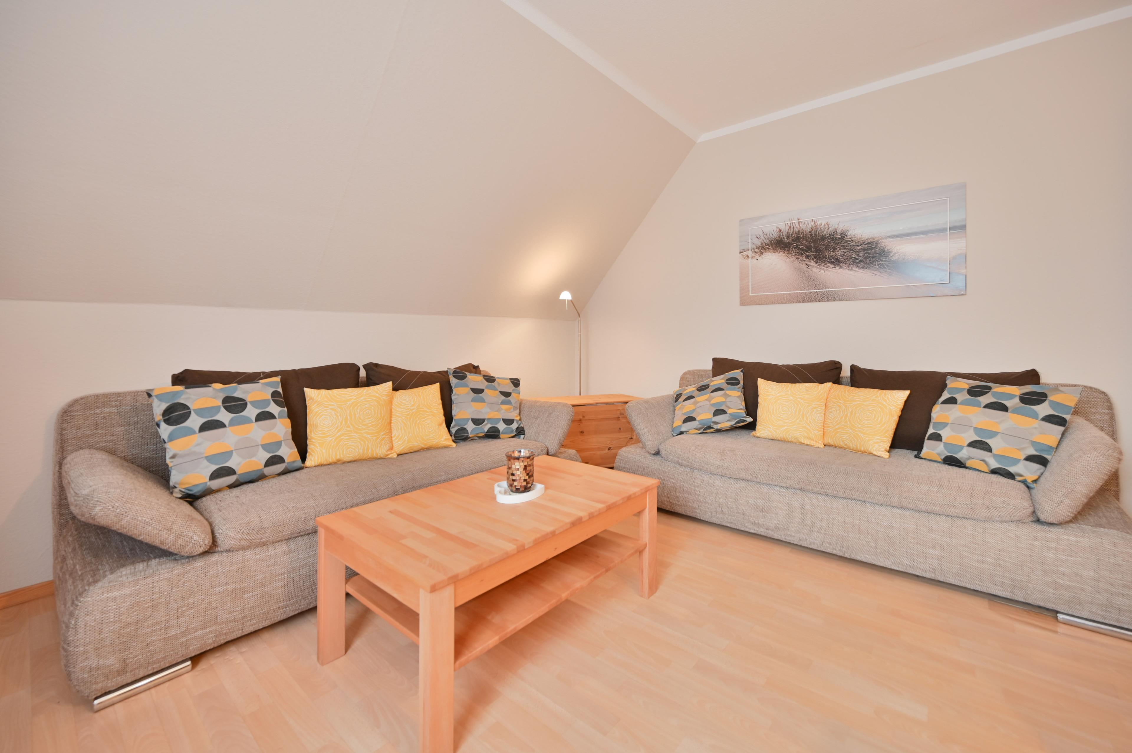 Das Wohnzimmer ist mit zwei bequemen Sofas (mit Schlaffunktion), Kommode mit Flachbild-TV und einem Essbereich mit 4 Stühlen eingerichtet.