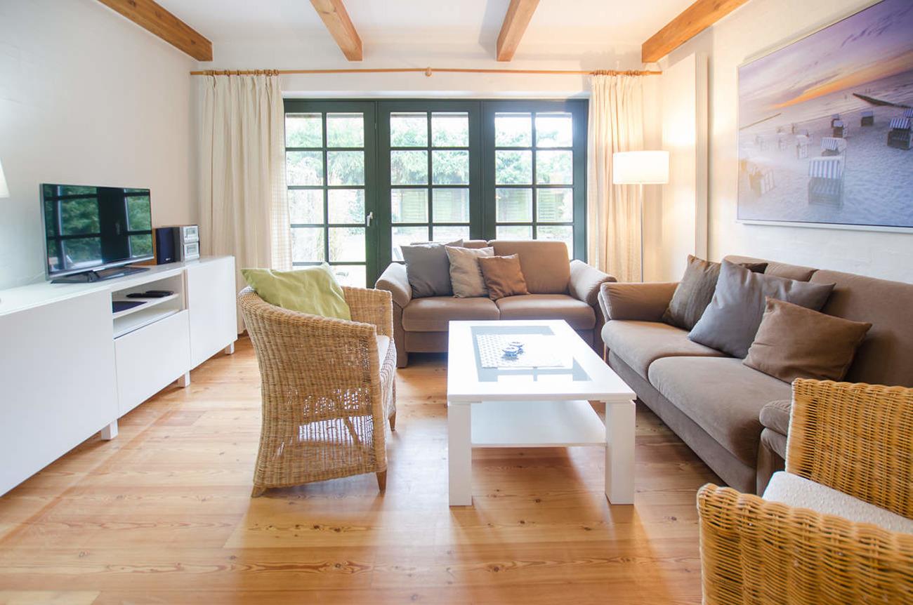 Das schöne Ferienhaus von Familie Schünemann verfügt im Erdgeschoss über einen Wohn-Essbereich mit integrierter Küchenzeile und Essplatz (Tisch mit vier Stühlen), gemütlicher Sitzgruppe mit Kaminofen und Zugang zur Terrasse und zum schönen Garten.