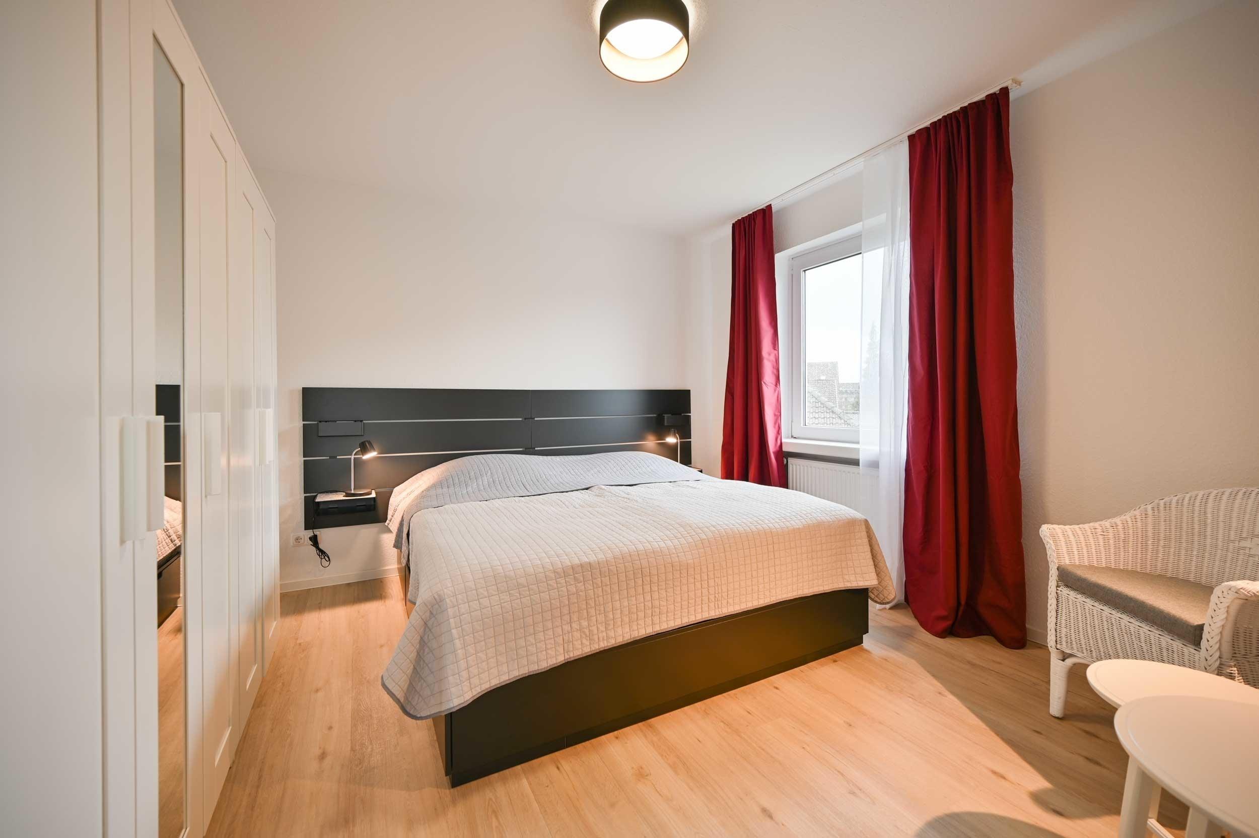 Das separate Schlafzimmer verfügt über ein Doppelbett mit Ablage und Leseleuchten, einen Kleiderschrank und eine Sitzecke.