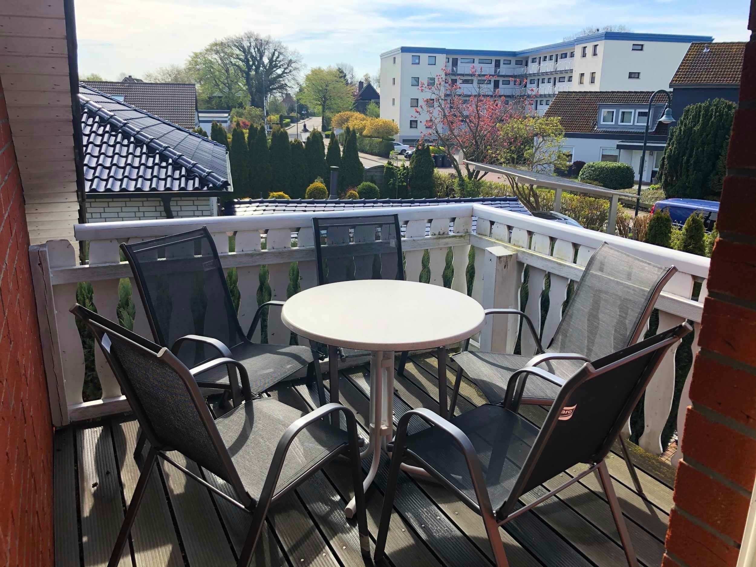 Zur gemütlichen Ferienwohnung gehört ein Südost-Balkon mit Tisch und Stühlen.