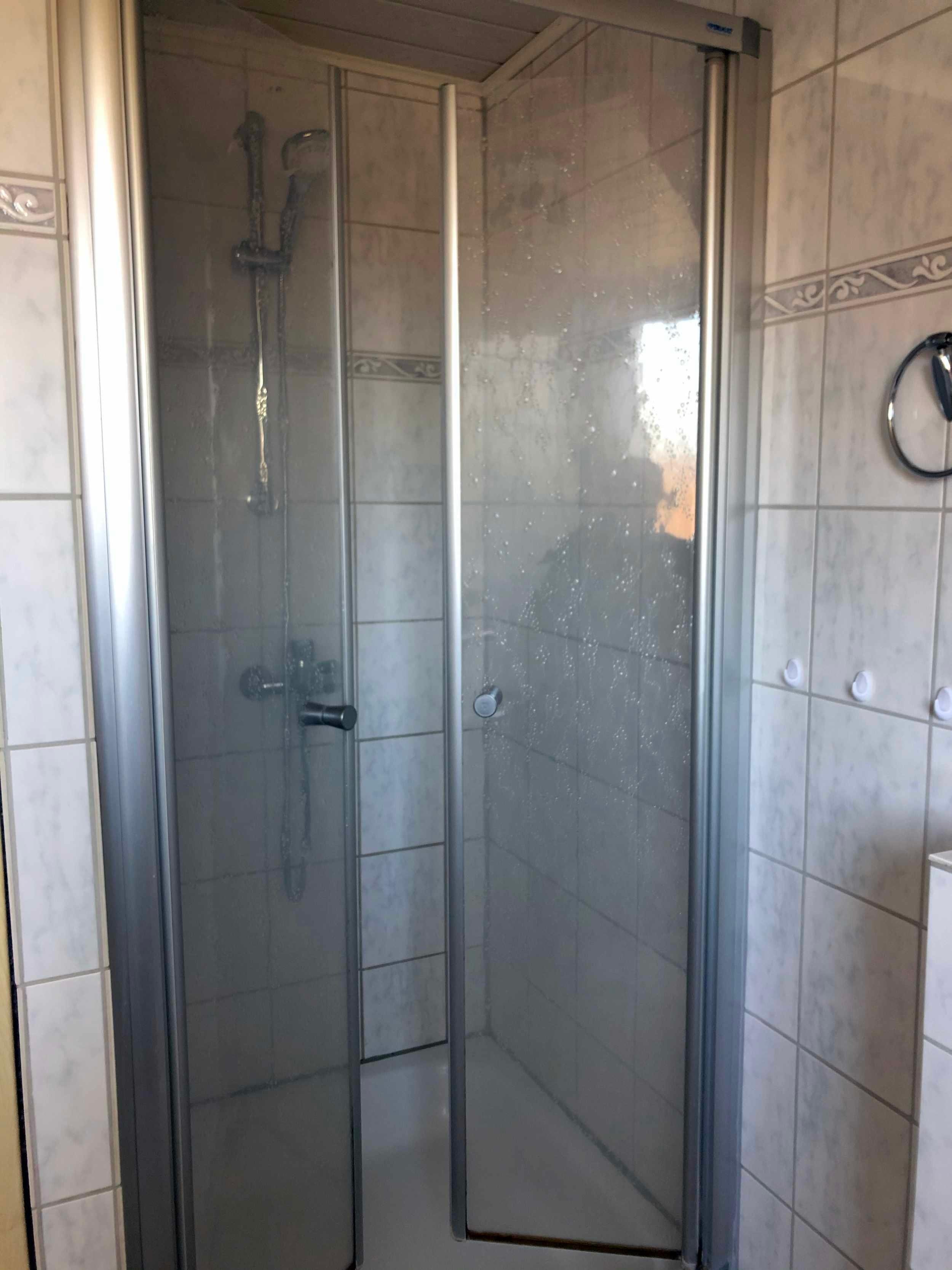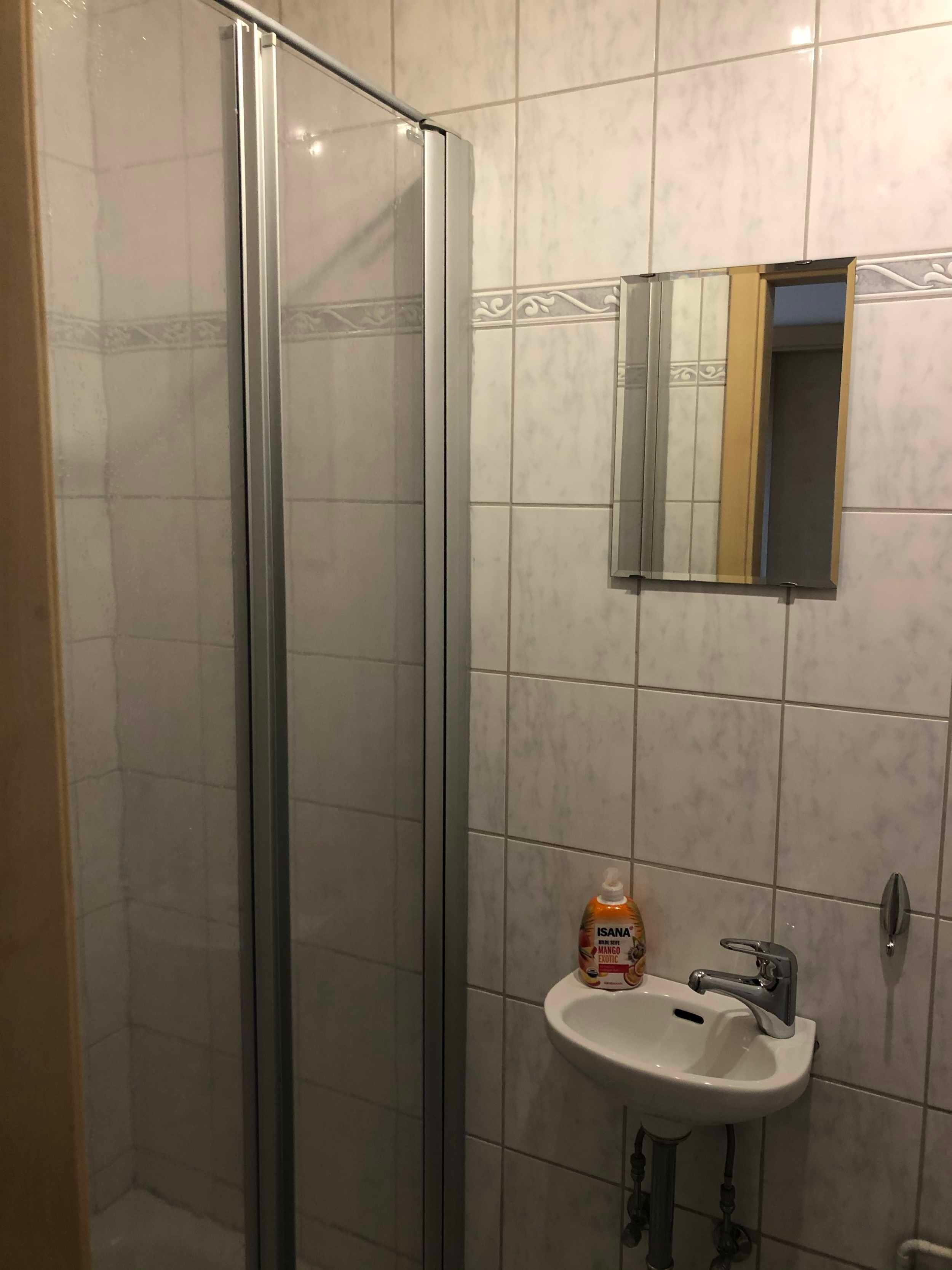 Außerdem verfügt die Ferienwohnung über ein Gäste-WC mit Dusche, Handwaschbecken und Spiegel.