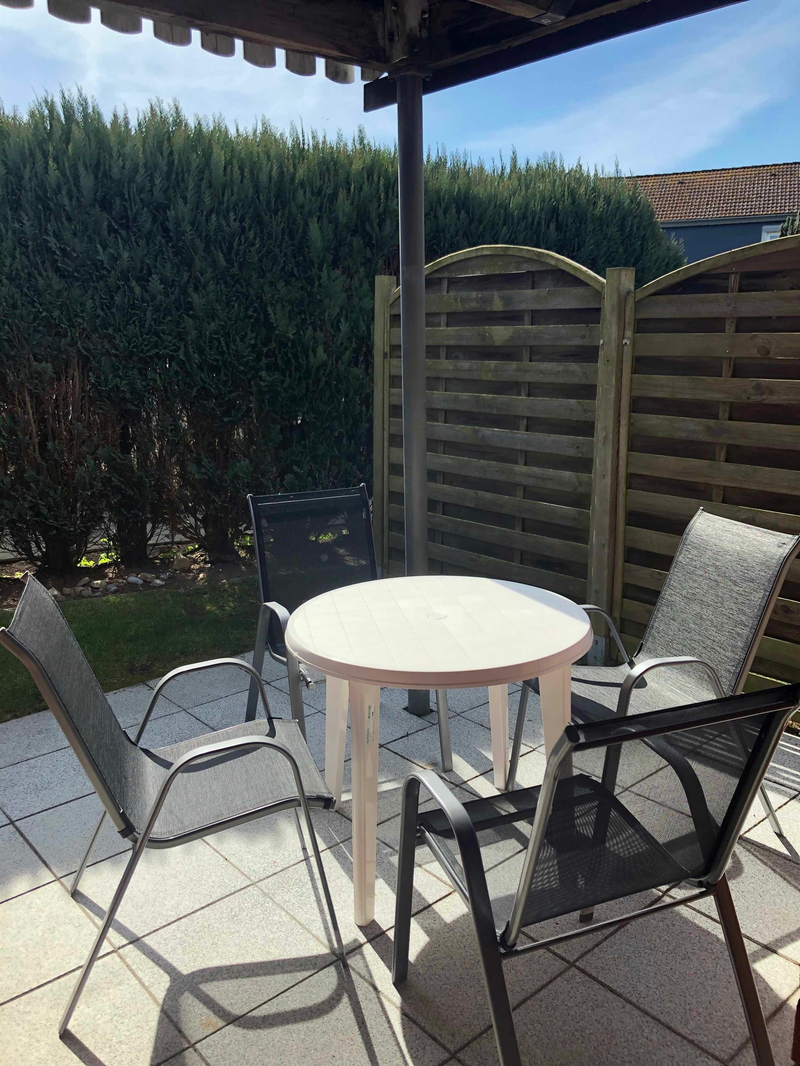 Zur modernen Ferienwohnung gehört eine ebenerdige Südost-Terrasse mit Tisch und Stühlen und direktem Zugang zum Rasen.