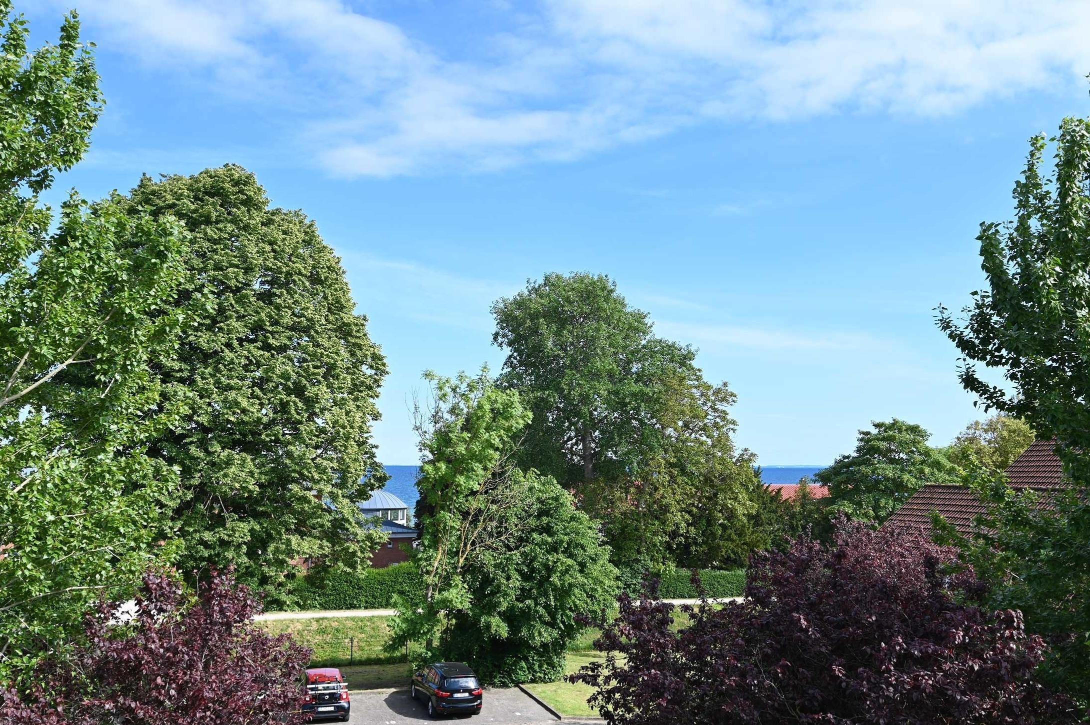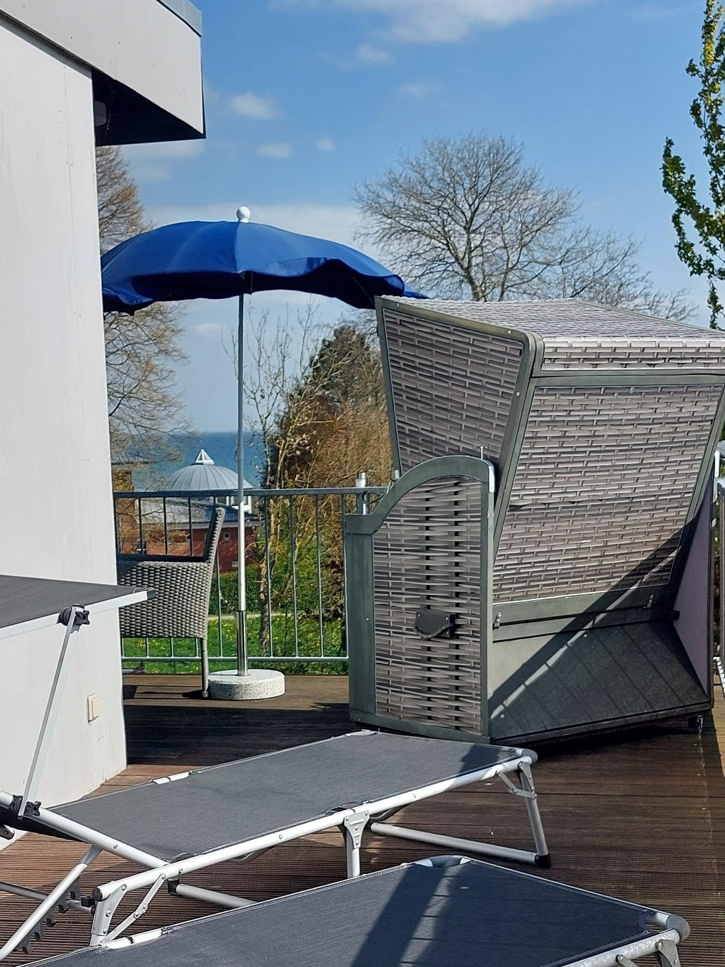 Der Balkon der Ferienwohnung erstreckt sich komplett um das Appartement und bietet mit Balkonmobiliar und Strandkorb den perfekten Rahmen für Ihren Erholungsurlaub. Zwischen den Bäumen bietet sich ein Weitblick zur Ostsee.