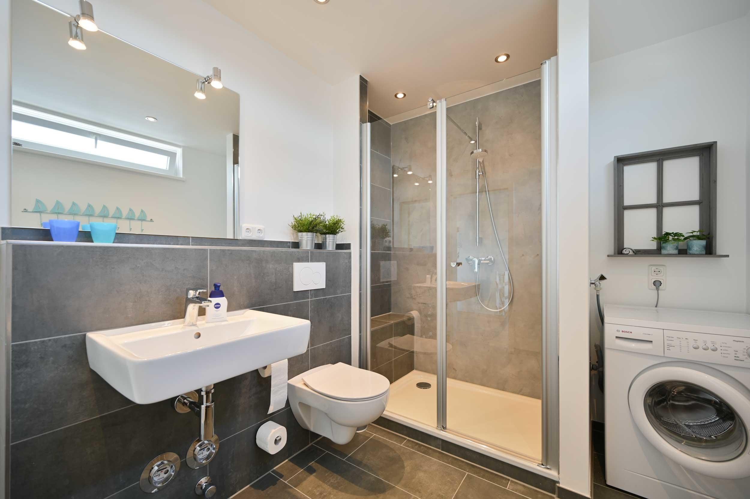 Badezimmer mit Dusche, Waschbecken, WC und Waschmaschine.