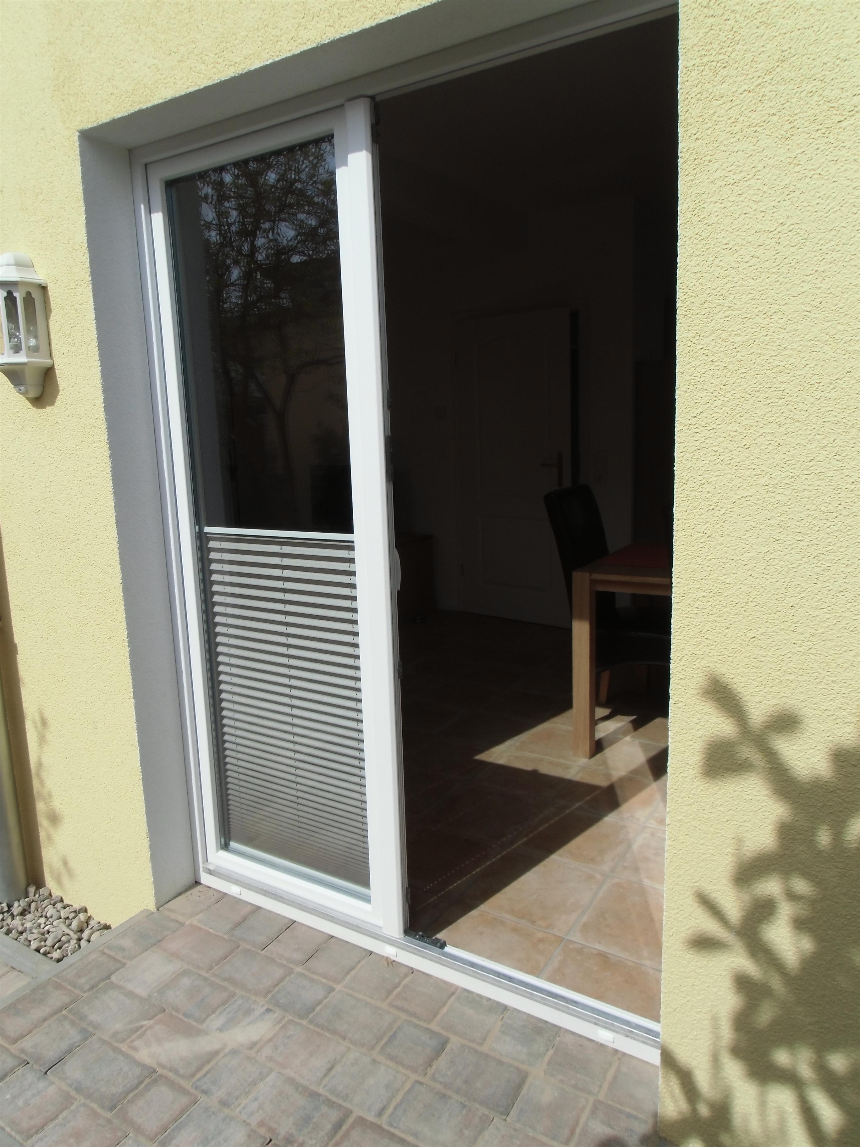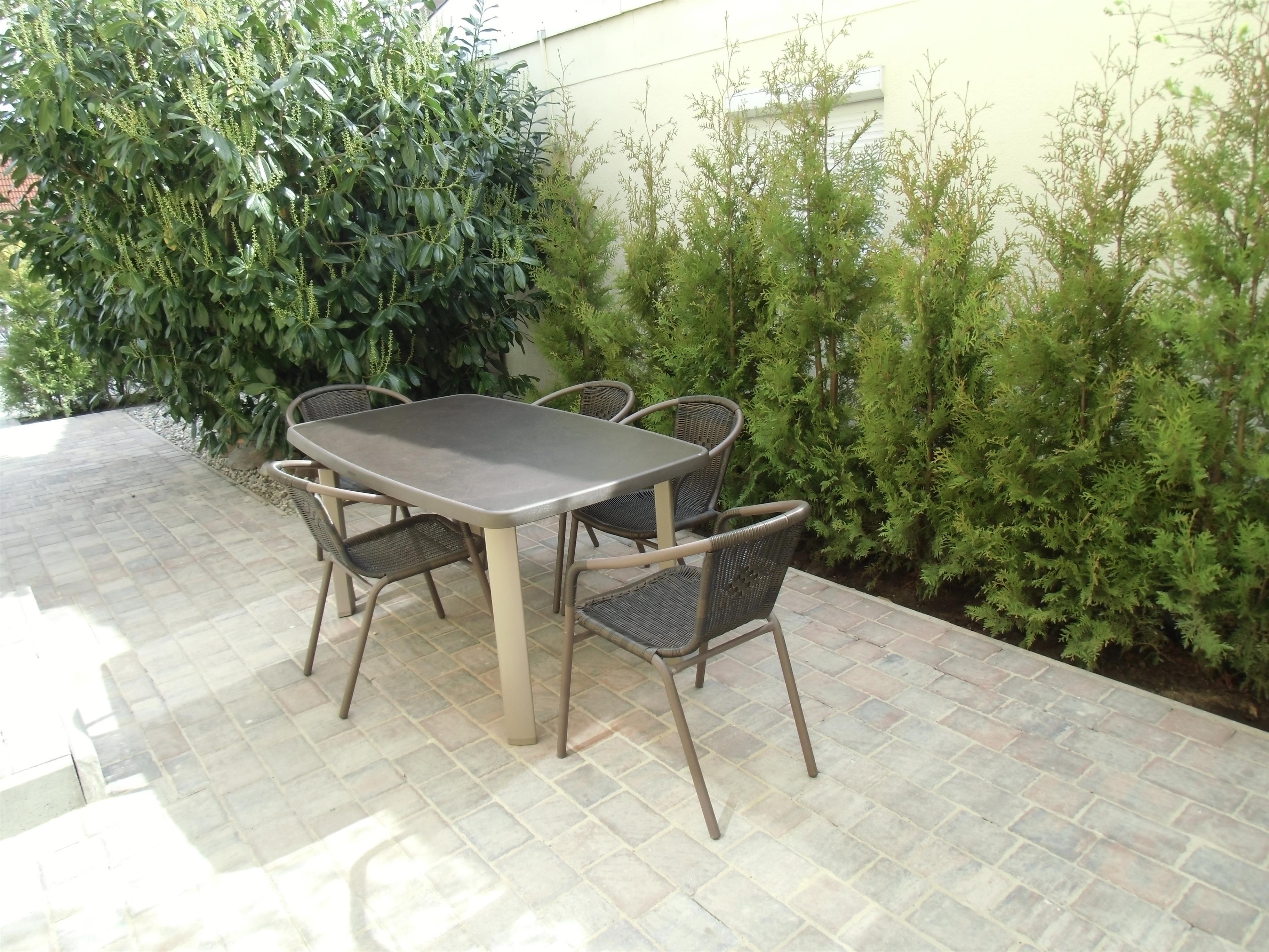 Vorhanden sind Gartenstühle und Tisch, Grill, Tresor und Staubsauger.