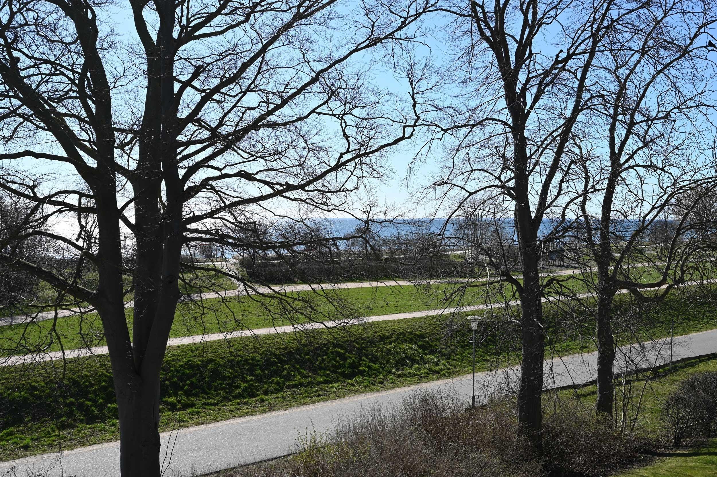 Zwischen den grünen Bäumen kann man die Ostsee glitzern sehen.