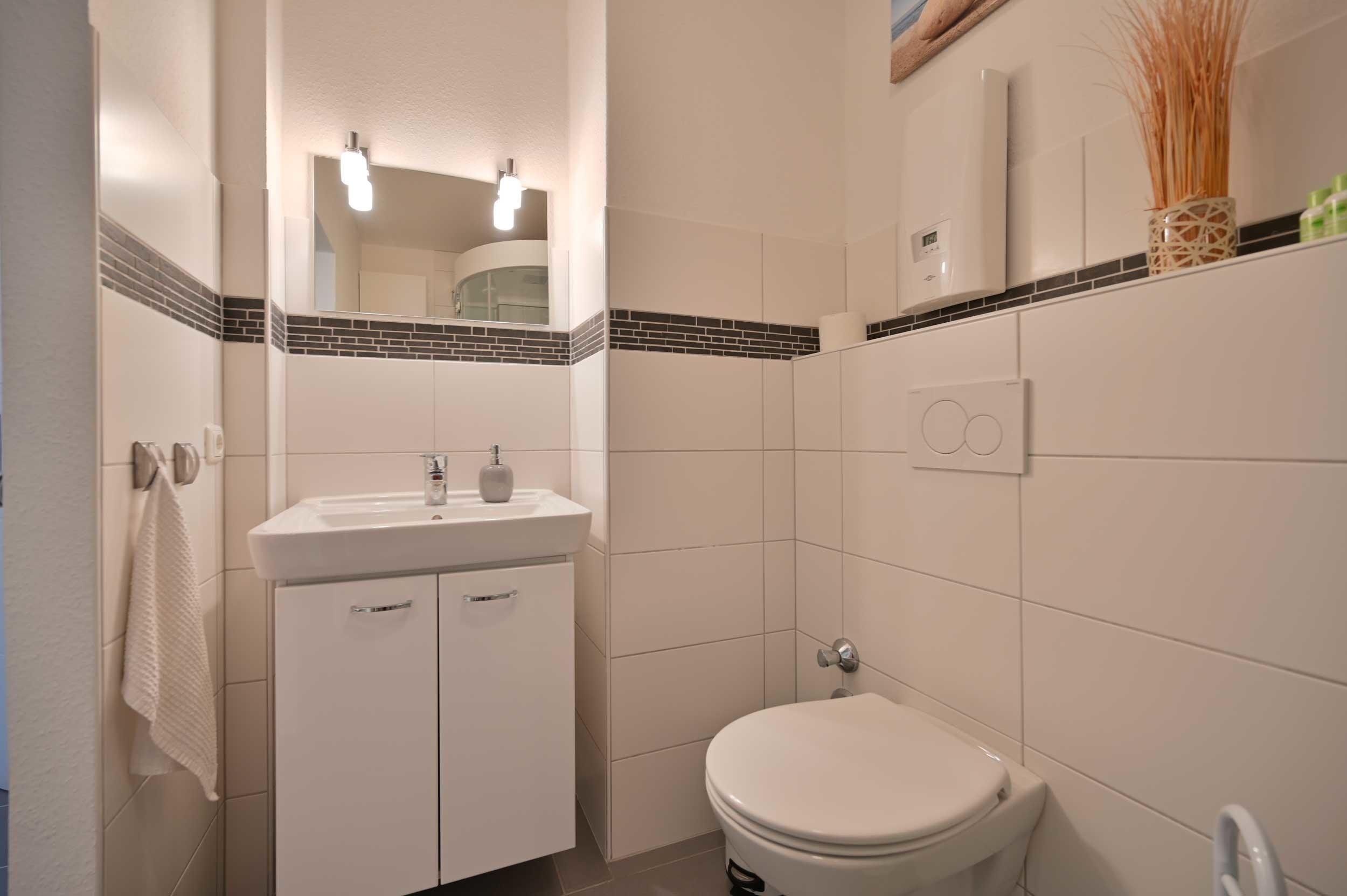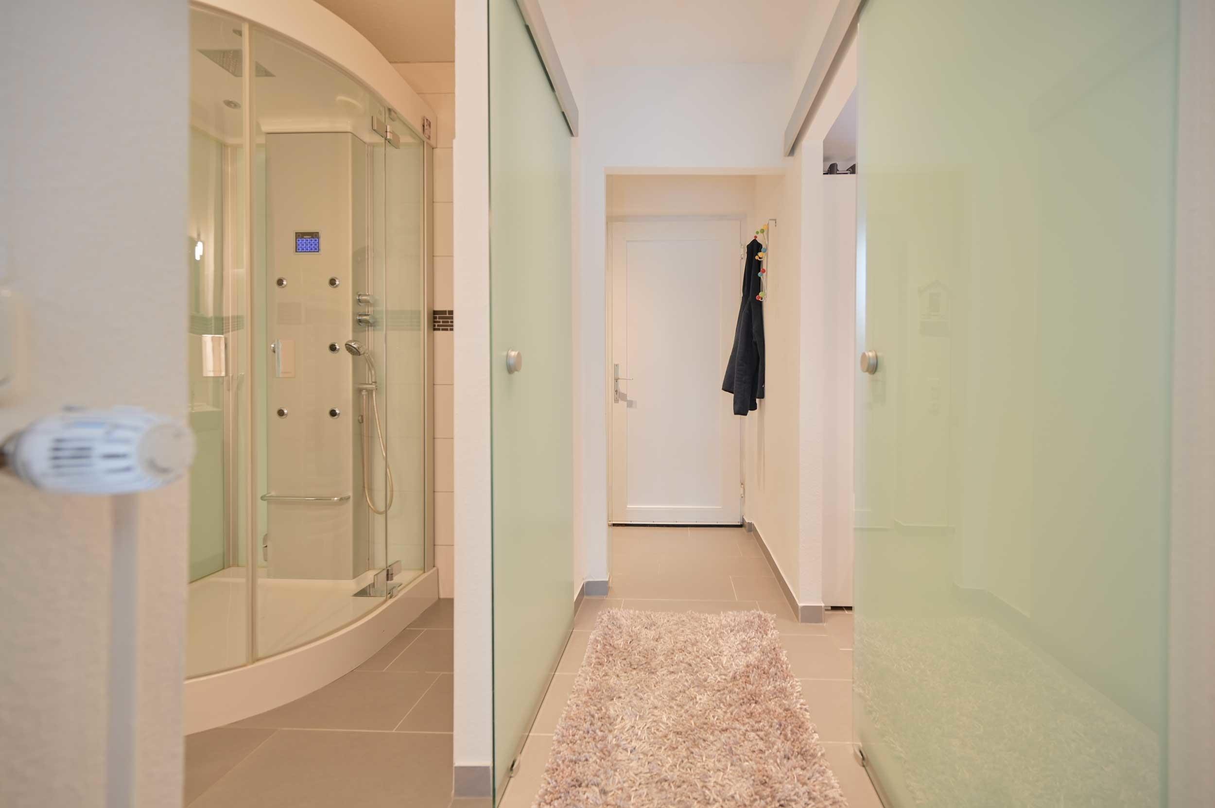 Im Flur finden Sie eine Garderobe. Das neuwertige Bad ist mit einem wandhängendem WC, Dusche, Waschbecken und einem Handtuchheizkörper ausgestattet.