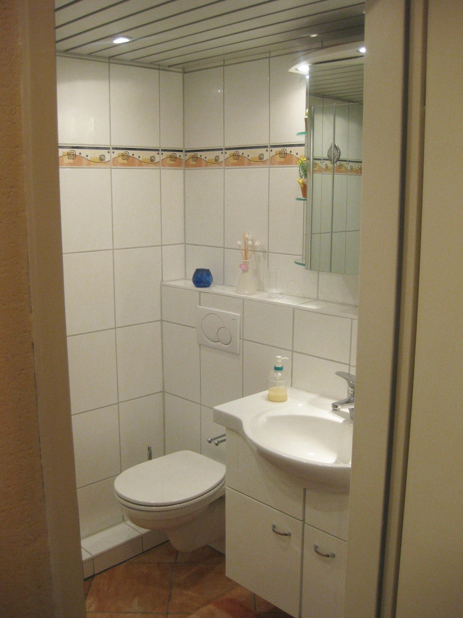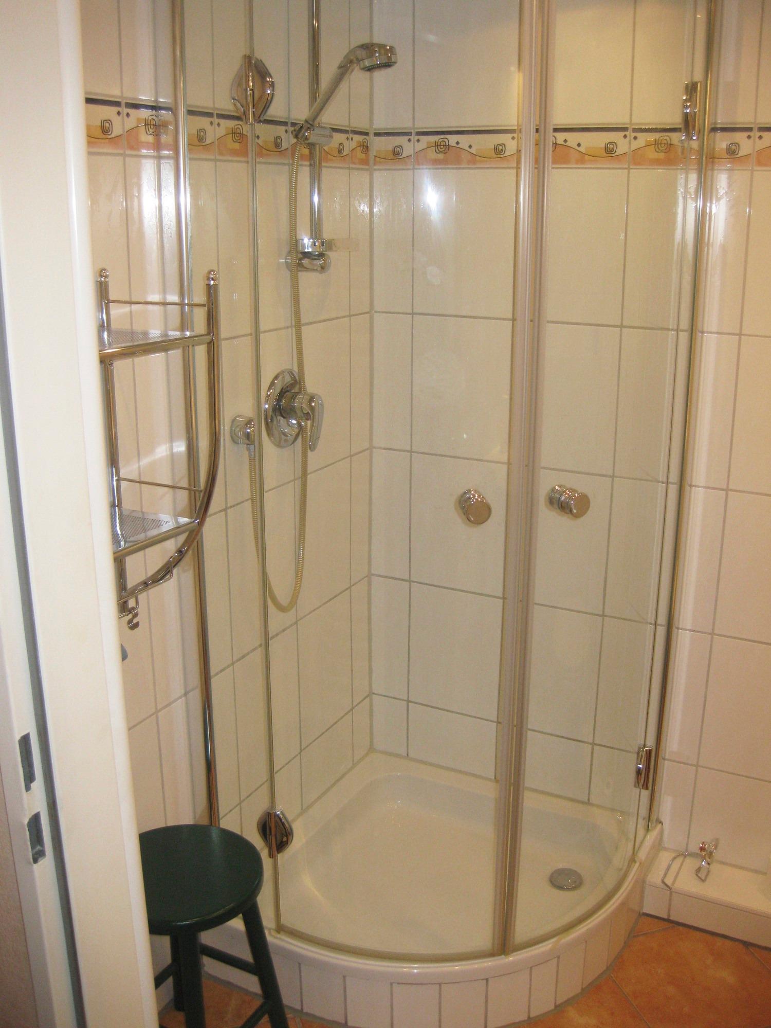 Das Badezimmer ist neu renoviert. Es ist hell gefliest und verfügt über eine moderne Runddusche. Ein großzügiger Spiegelschrank bietet Platz für alle mitgebrachten Utensilien.