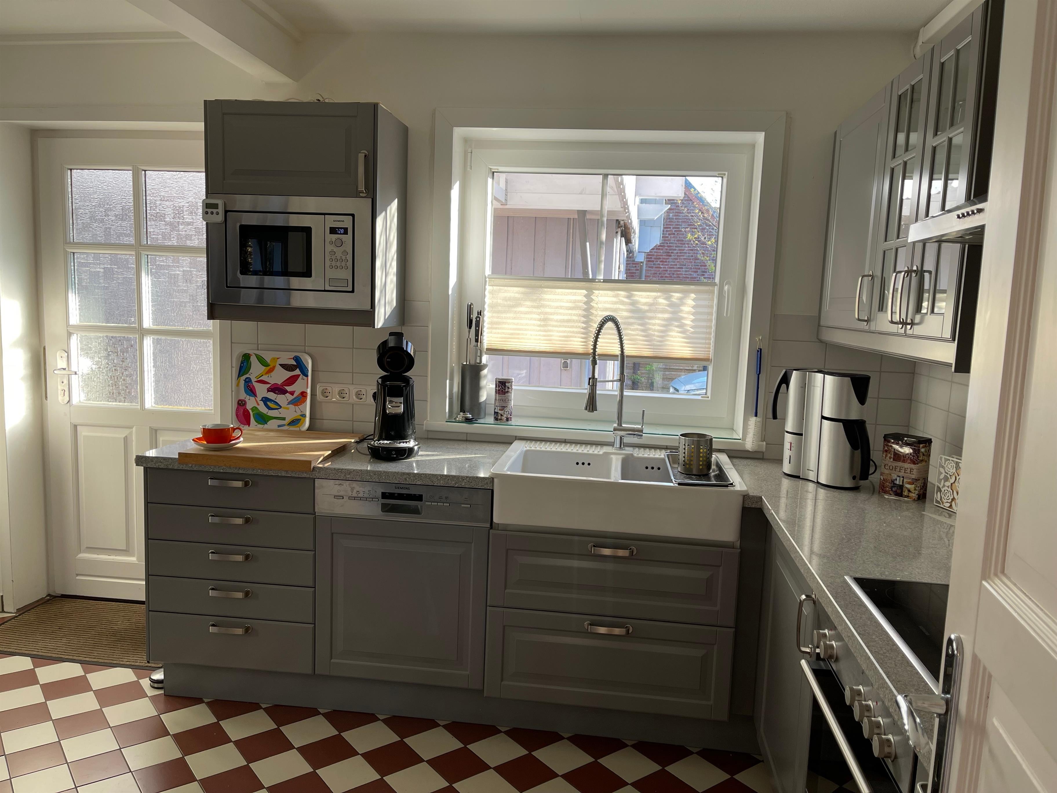 Die Küche ist voll ausgestattet mit Geschirrspüler, Herd, Backofen, Kühlschrank mit Gefrierfach, Mikrowelle und Kaffeemaschine.