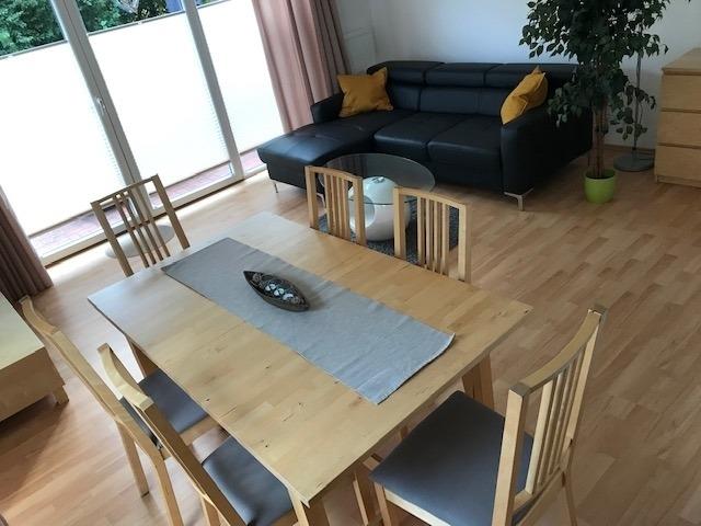 Das großzügige Wohn- und Esszimmer ist dank bodentiefer Fenster lichtdurchflutet und schafft eine freundliche, offene Atmosphäre. Die modernen Esszimmermöbel sind in hellem Holz gehalten. Der Wohnbereich verfügt über eine moderne Ledercouch. Vom Wohnzimmer aus haben die Sie direkten Zugang zur Terrasse und zum Garten.