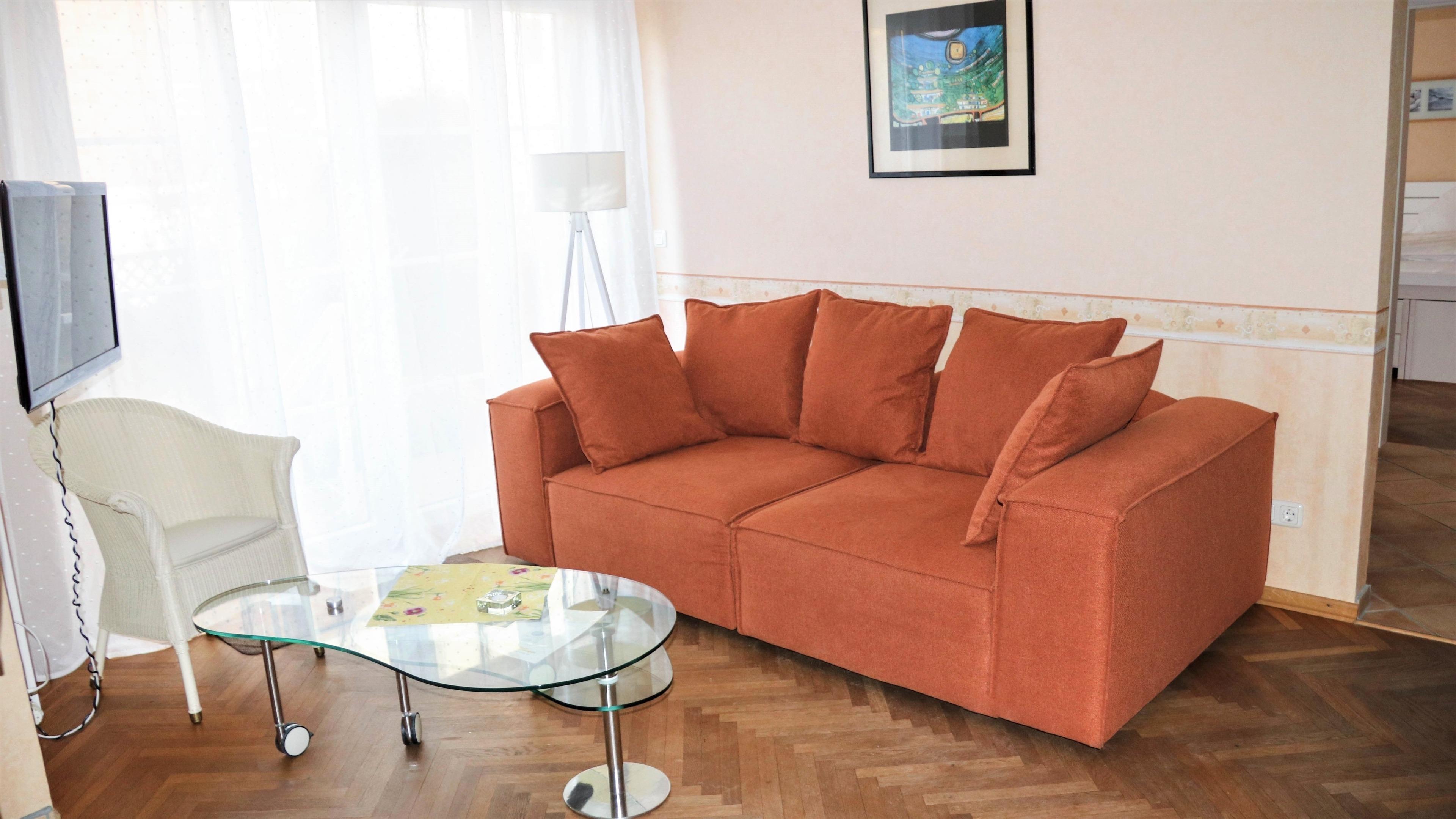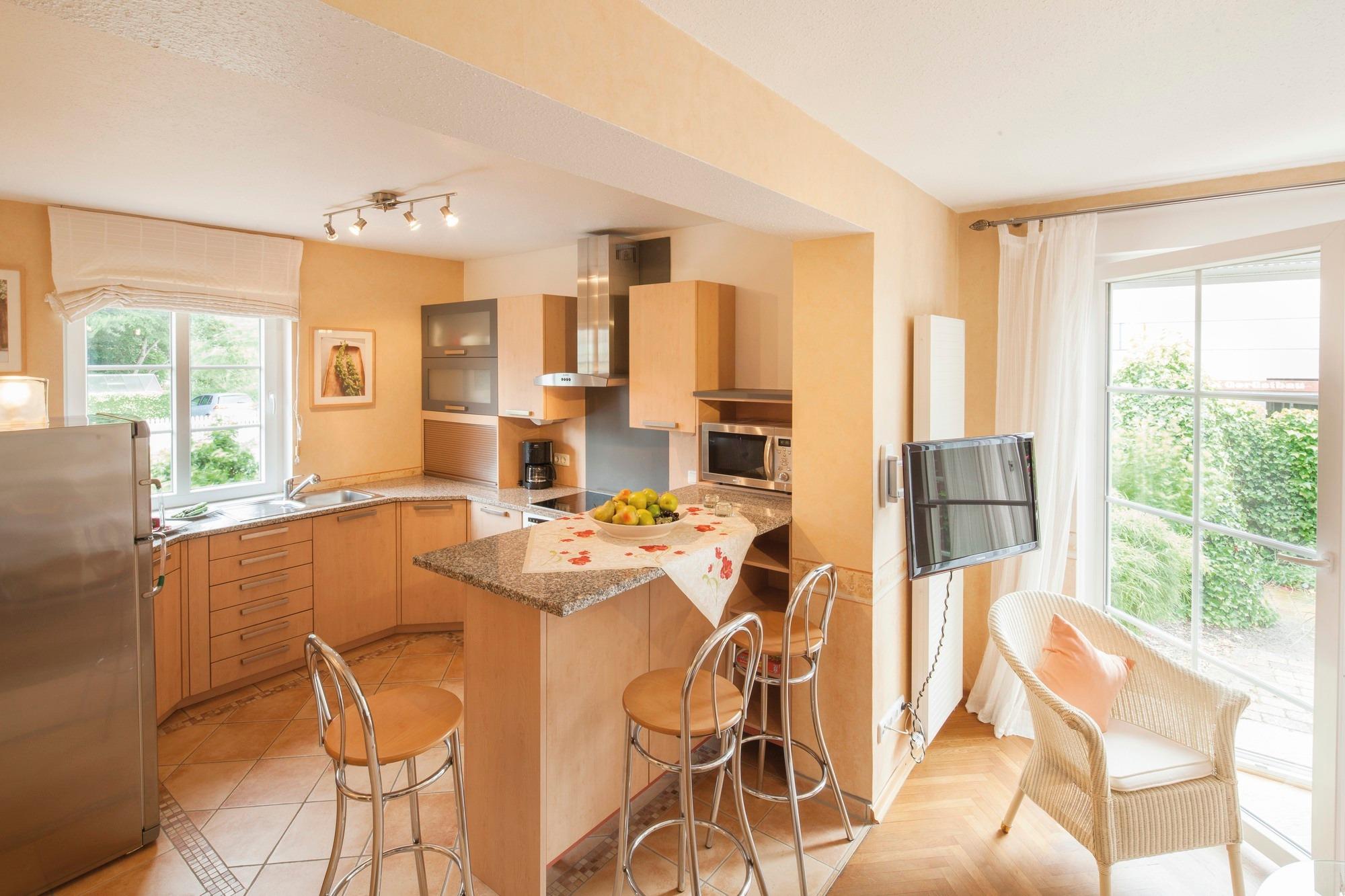 Diese Erdgeschosswohnung bietet großzügigen Platz für 2 Personen. Die große, offene Wohnküche ist im amerikanischen Stil gehalten. Sie essen an der Essbar.
