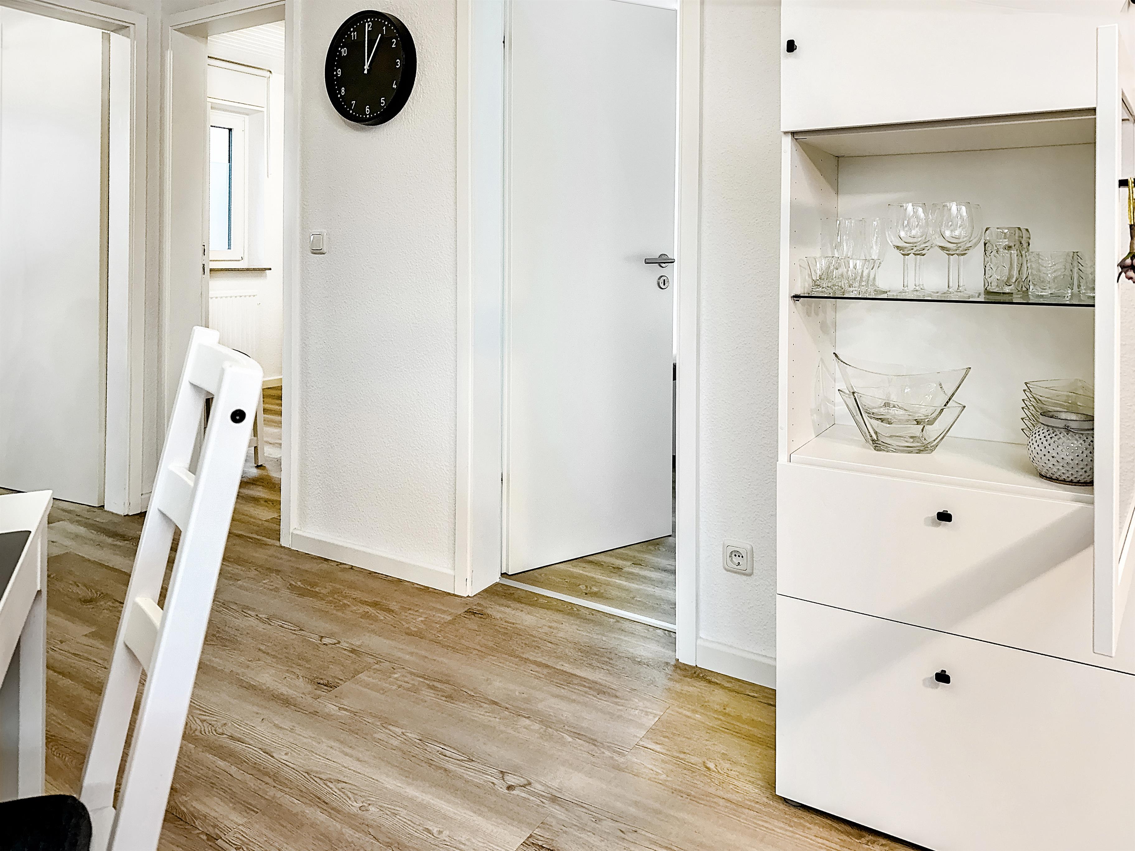 Duschbad mit Dusche, Fenster, Waschbecken und Waschmaschine, voll ausgestattete offene Küche mit Geschirrspüler, Kühlschrank, Kaffeemaschine, Backofen, Mikrowelle, Wasserkocher und Geschirr. Schlafzimmer (1) mit Doppelbett (2x 90x200), Kleiderschrank und Nachtischleuchten. Schlafzimmer (2) mit zwei Einzelbetten (90x200), Kleiderschrank und Nachtischleuchten. Wohn-/Esszimmer "Designerböden" mit Sofaecke, TV, Esstisch mit Stühlen und Zugang zum bestuhlten (2 Stühle, 1 Tisch) Süd/West-Balkon.