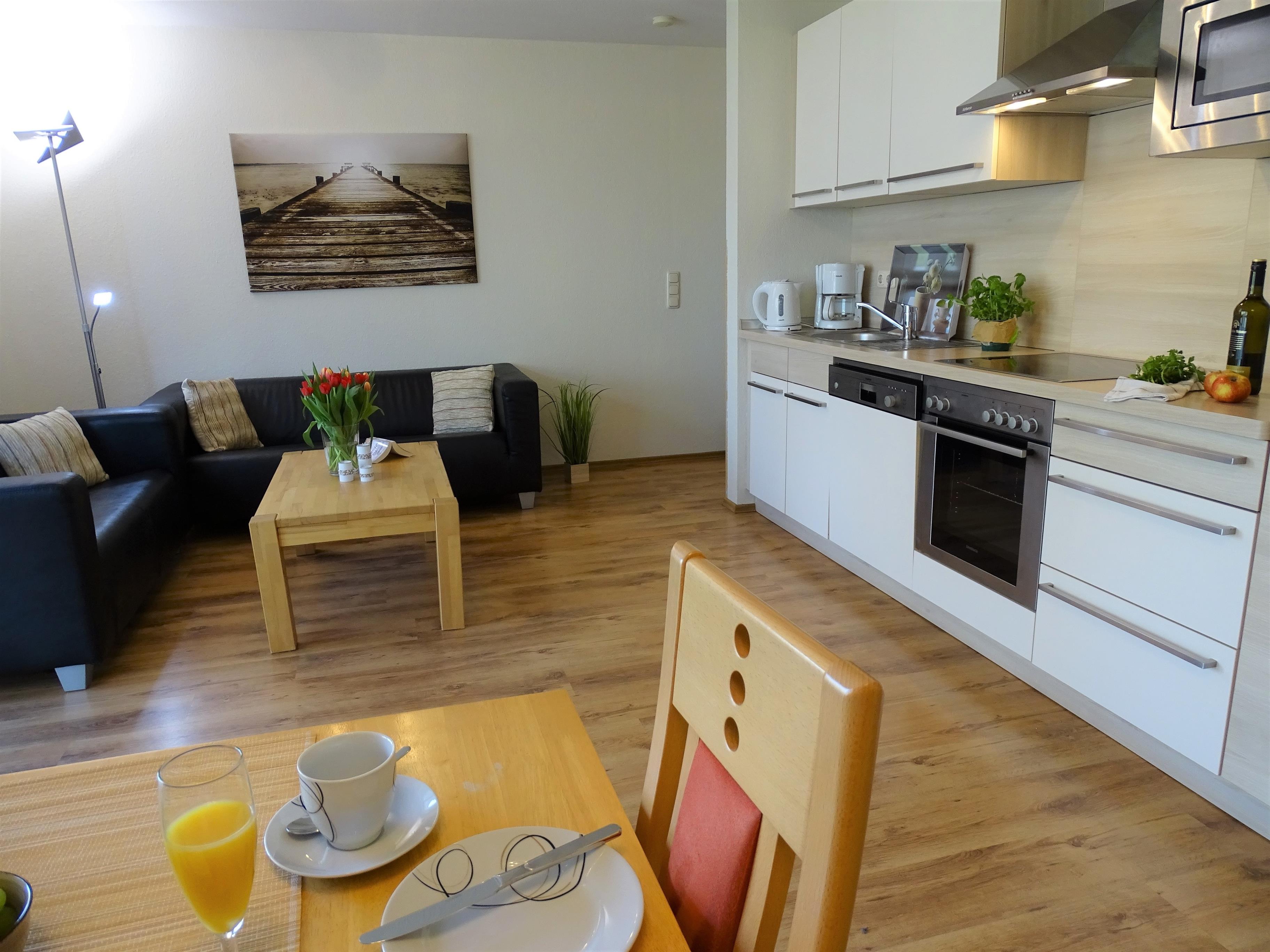 Unsere schöne und geräumige Ferienwohnung (ca.64m²) in ruhiger, strandnaher Lage ist ausgestattet für 4 Personen und verfügt über 2 separate Schlafzimmer. Sie befindet sich im 1. Obergeschoss des einladenden Hauses...Sie bietet ein modernes Wohnzimmer mit Couch- und Essecke, SAT-Flachbild-TV und integrierte offene Küchenzeile. Die Einbauküche ist mit Geschirrspüler, Backofen, Ceranfeld, Mikrowelle, Kaffeemaschine, Toaster uvm. ausgestattet... Die Schlafzimmer (einmal mit Doppelbett und eines mit getrennt stehenden Einzelbetten) sind gemütlich eingerichtet. Das Duschbad ist hell und geräumig. Genießen Sie Ihre Urlaubsstunden auch auf dem sonnigen Balkon...