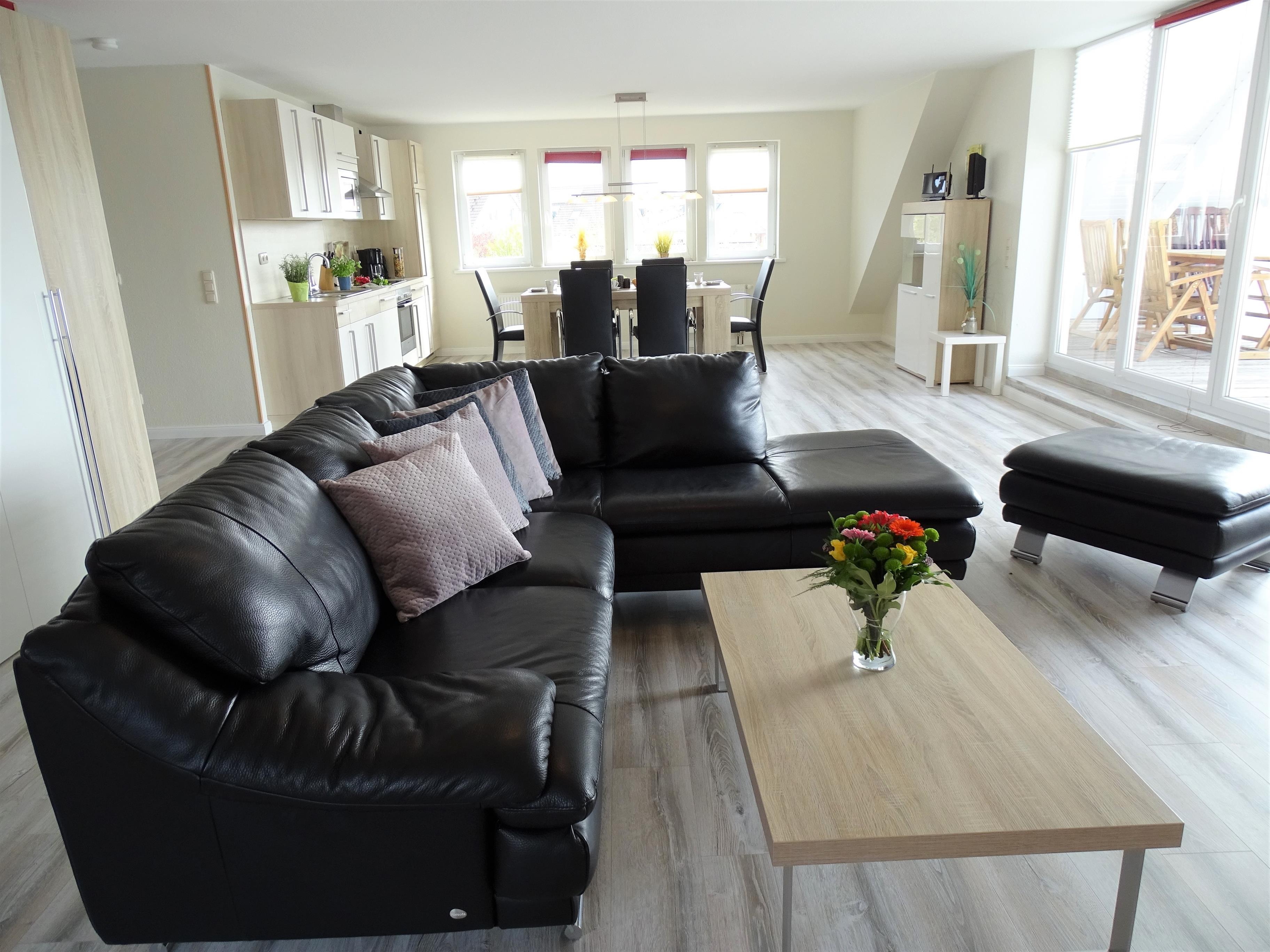 Auf großzügigen 120m² Wohnfläche verteilen sich 3 separate Schlafzimmer, 2 Bäder und eine modern offene Küchenzeile im Wohnbereich. Die etwa 60m² große Dachterrasse ist gen Süden ausgerichtet und bietet hierdurch ein besonderes Wohnambiete...Diese Ferienwohnung ist hell, modern und sehr einladend gestaltet und wird Sie zu überzeugen wissen. Es erwartet Sie ein großzügiges Wohn-/Esszimmer mit Flachbild- TV und DVD-Player, eine offene in den Wohnbereich integrierte gut ausgestattete Einbauküche mit 4-Platten-Ceranfeld mit Backofen, Geschirrspüler, Mikrowelle, Kaffeemaschine, Toaster uvm., 3 gemütlichen Schlafzimmer mit jeweils einem Flachbild-TV.