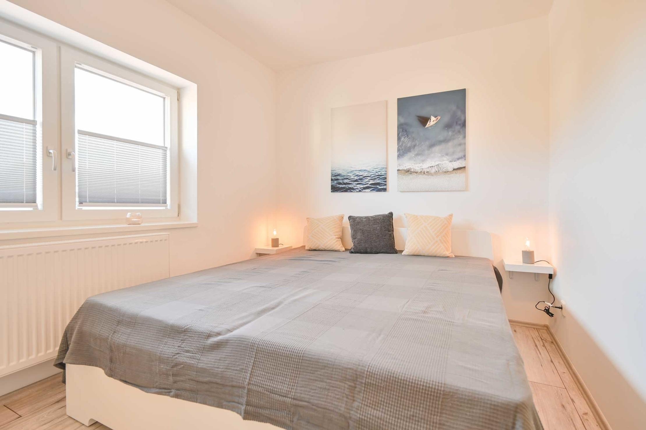 Das Schlafzimmer verfügt über Doppelbett, Nachttischen mit Leseleuchten und Kleiderschrank.