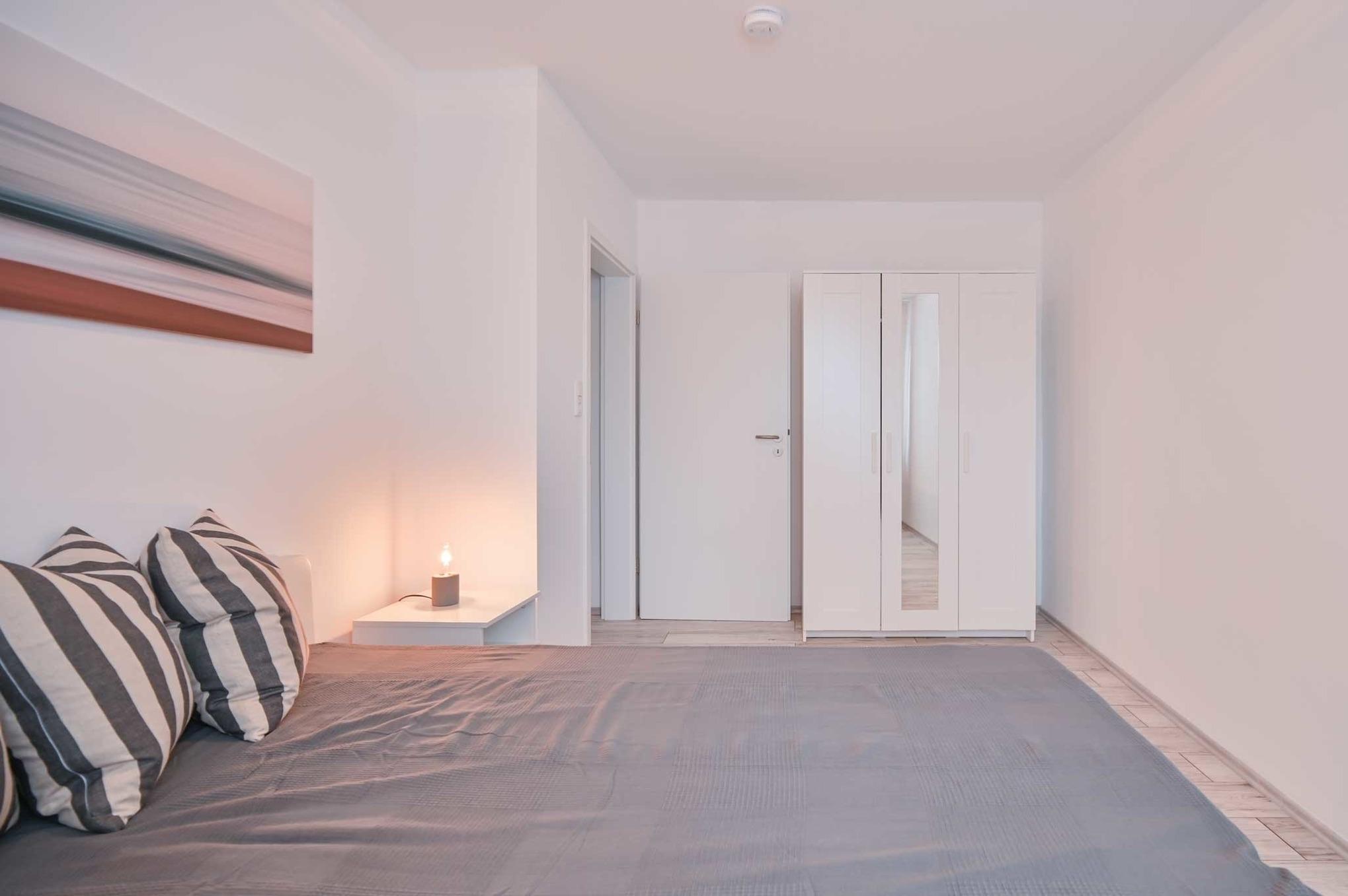 Schlafzimmer mit Doppelbett, Nachttischen mit Leseleuchten und Kleiderschrank.