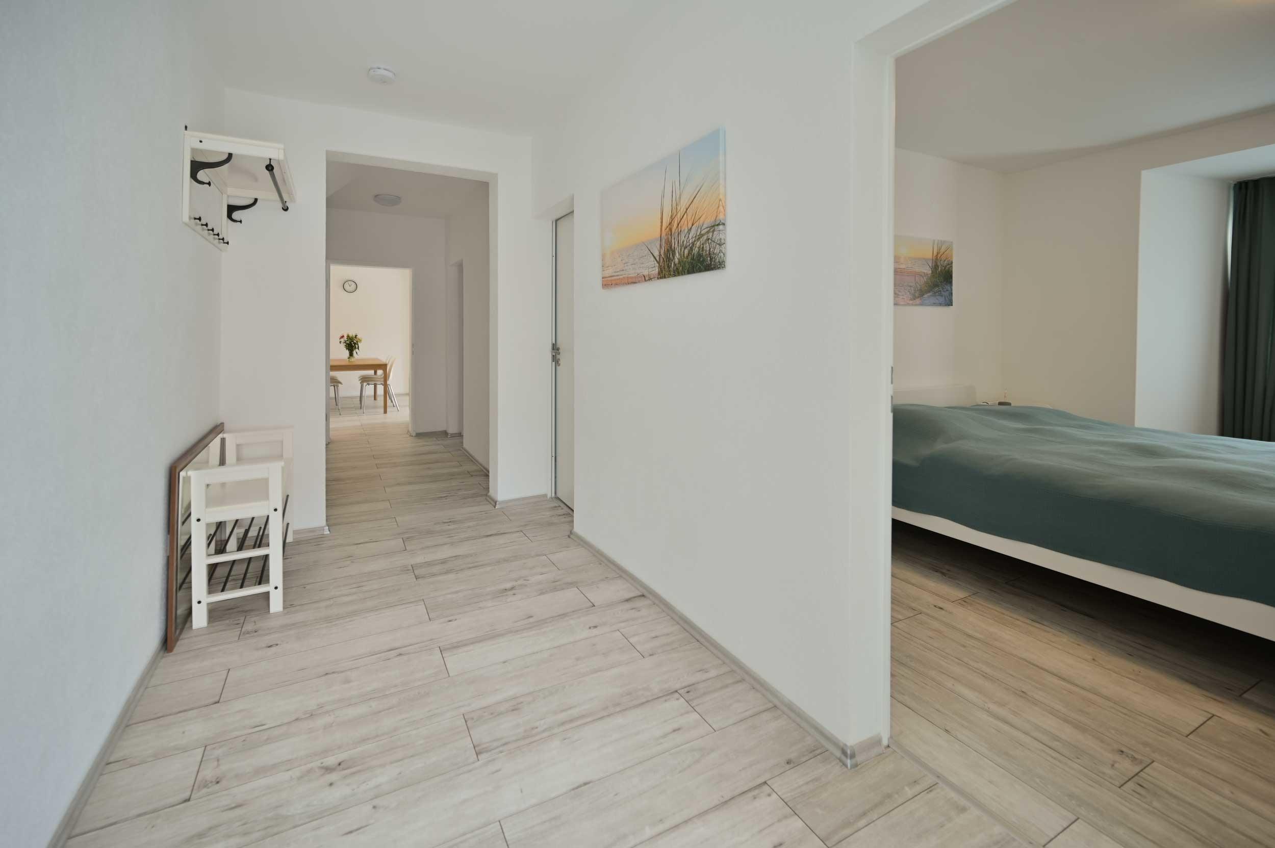 Von Hier aus geht es in zwei Schlafzimmer, das große Wohnzimmer, die Küche und das Badezimmer.