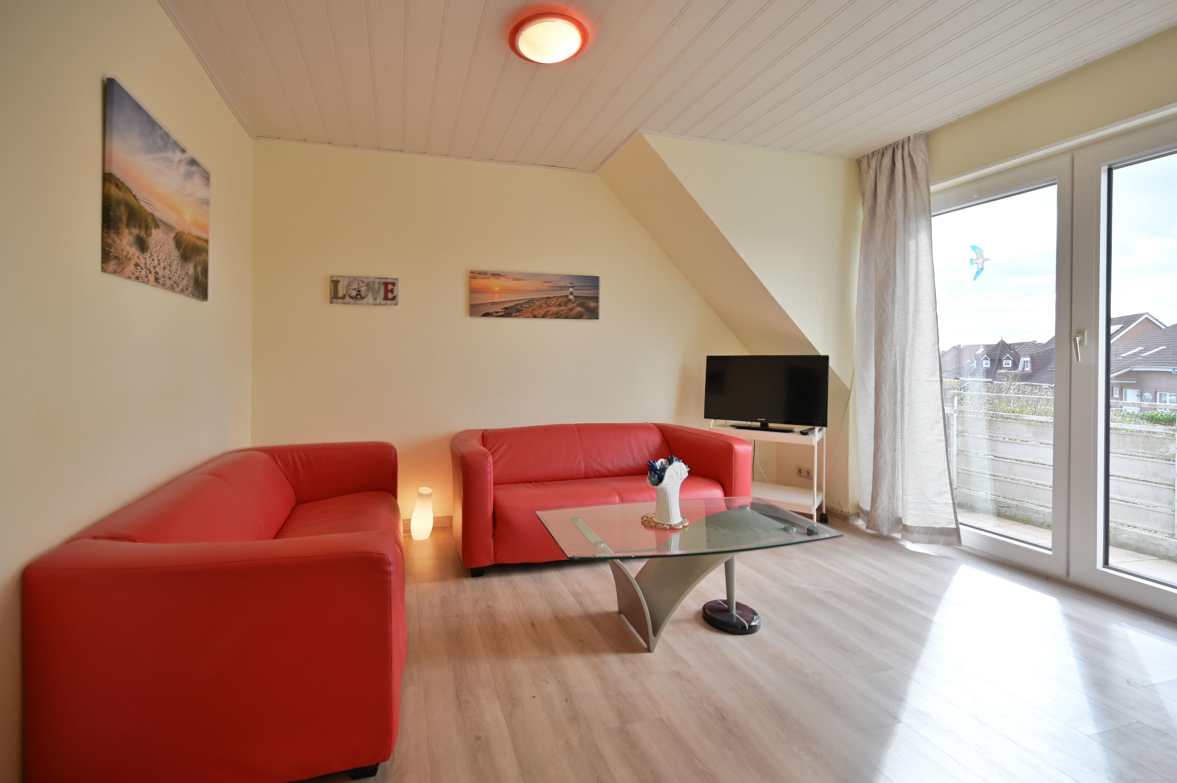 Ferienwohnung im Obergeschoss des Hauses Schlehenkoppel 12a. Der Wohnbereich der Fewo ist mit TV, zwei Sofas, Couchtisch, Esstisch mit 4 Stühlen und einer Küchenzeile eingerichtet.