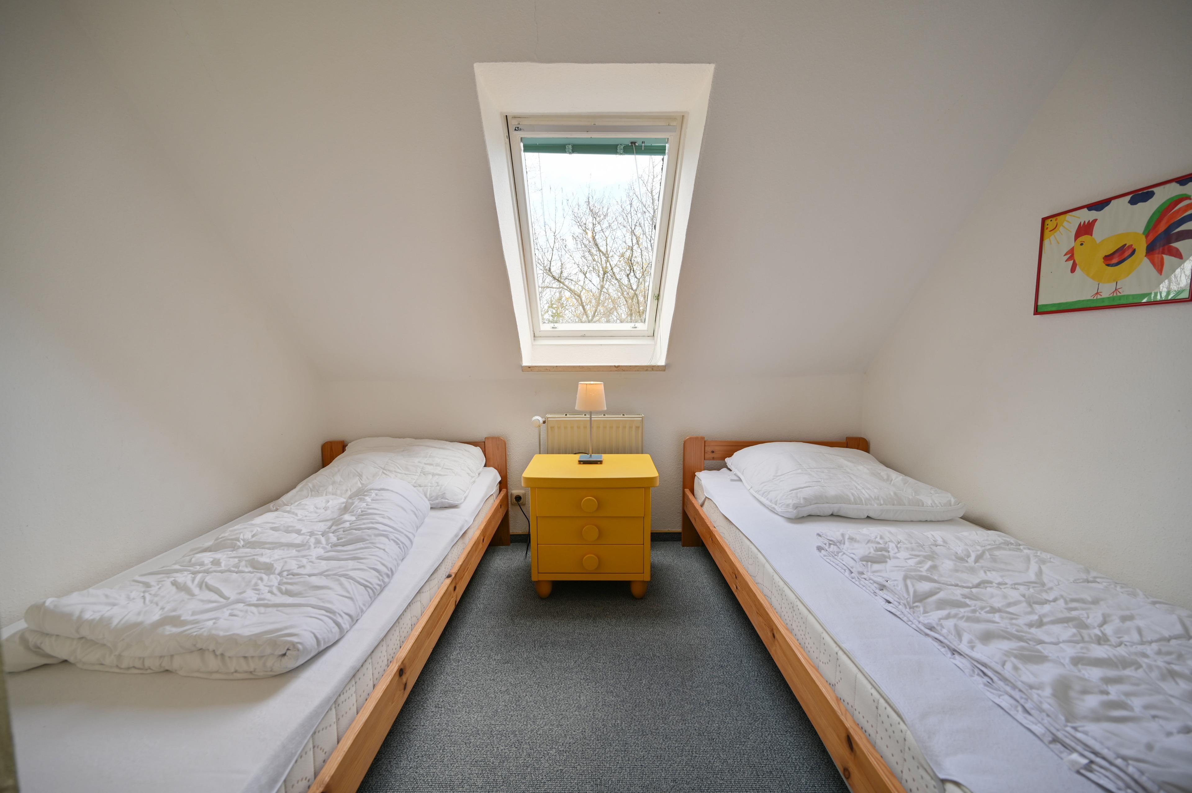 Zweites separates kleines Schlafzimmer mit zwei Einzelbetten und Kleiderschrank.