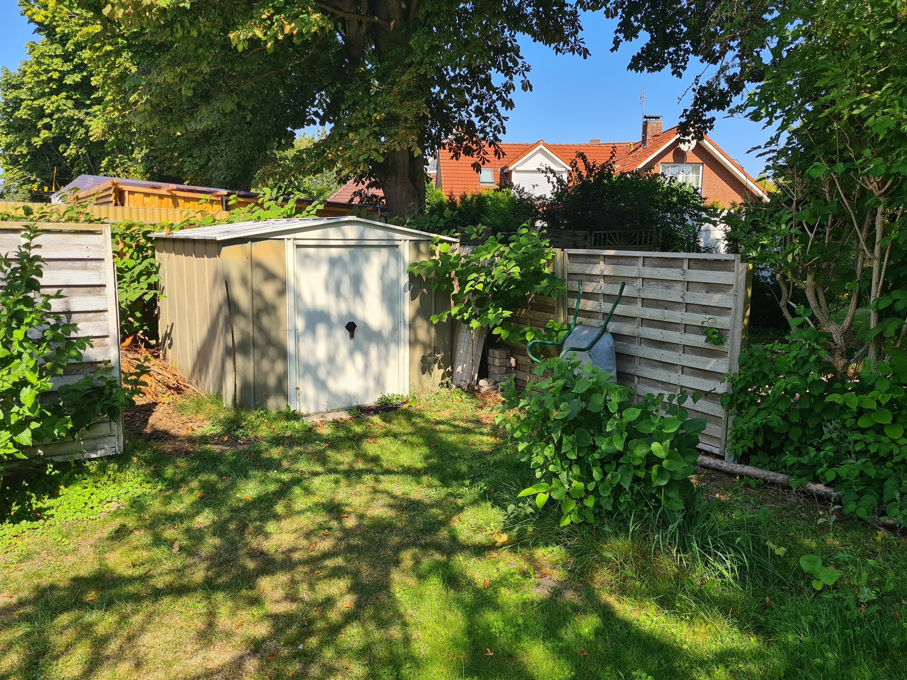 Außerdem befindet sich im Garten eine abschließbare Blechhütte für Fahrräder.