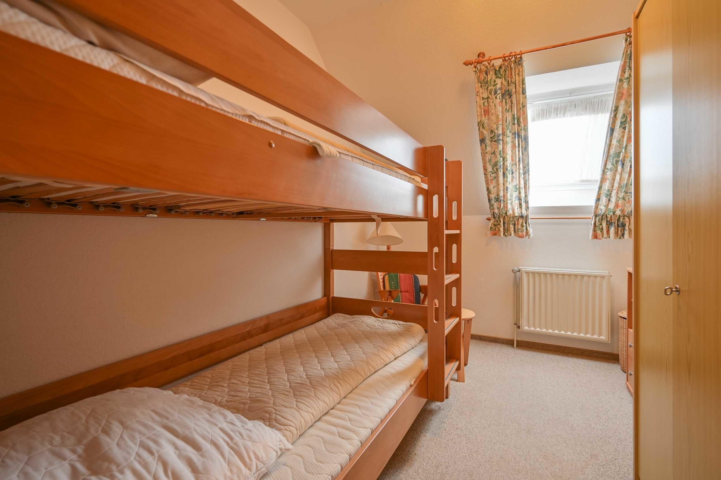 Das kleine Schlafzimmer ist mit einem Etagenbett und Kleiderschrank eingerichtet.