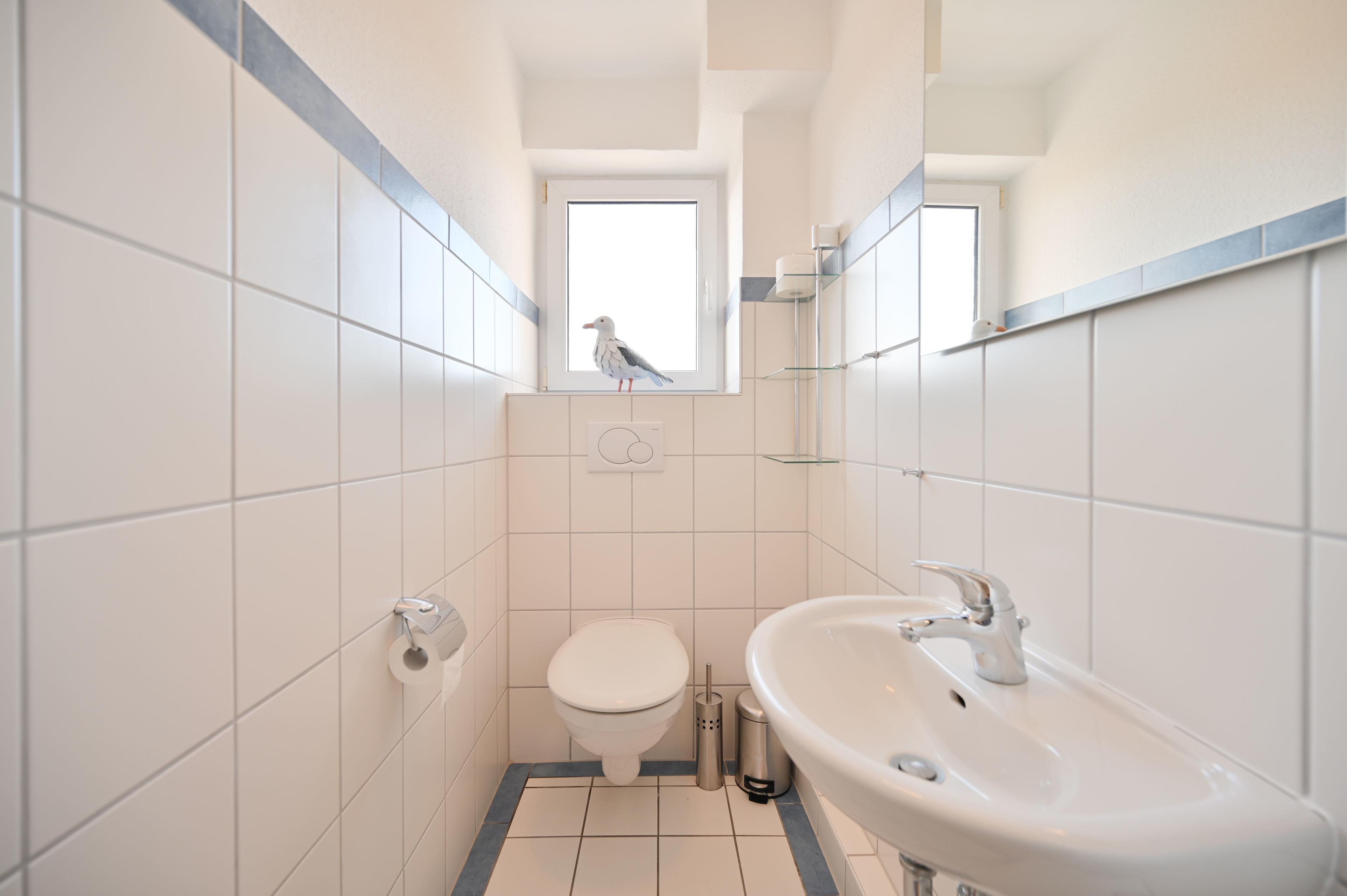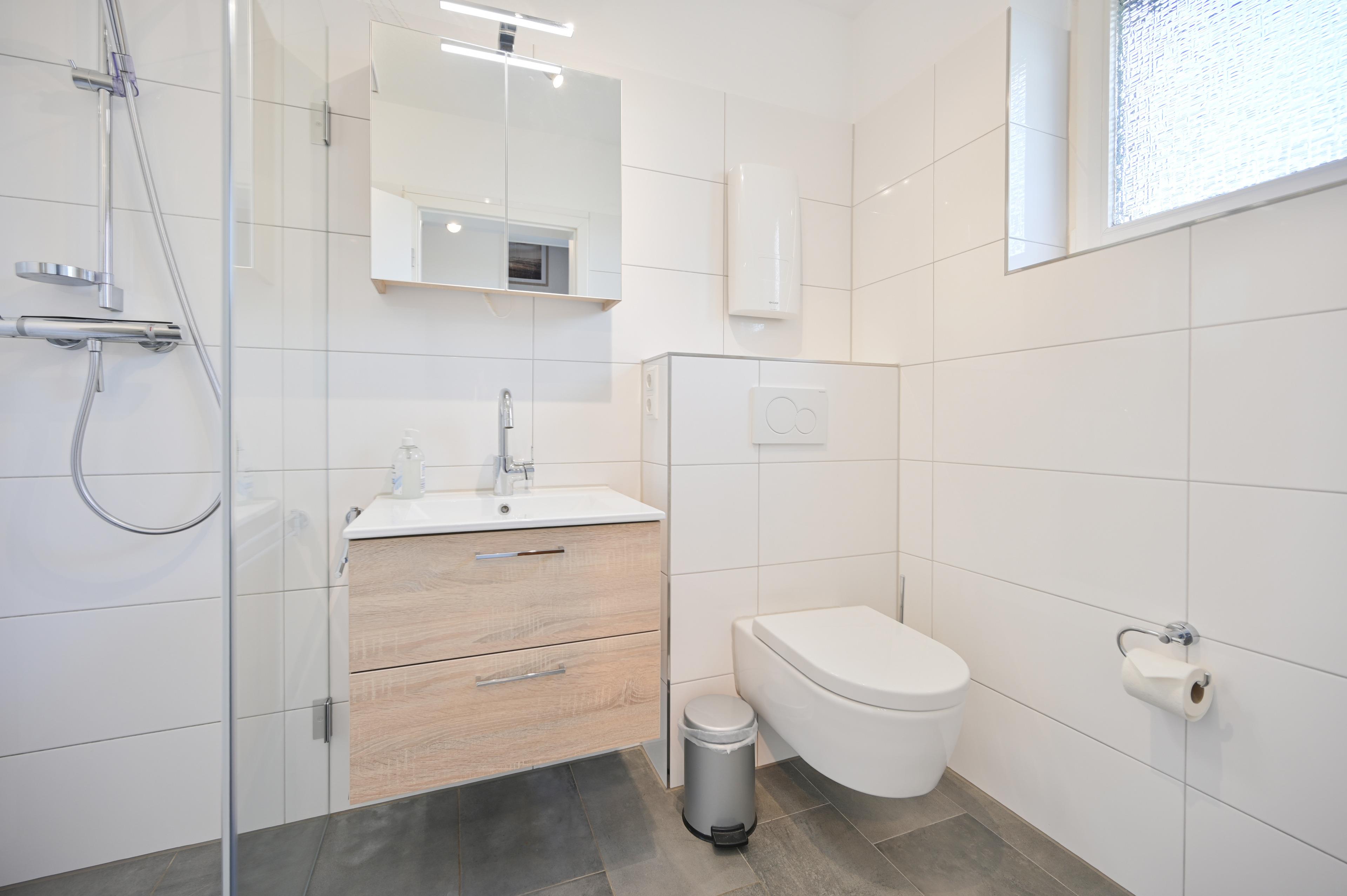 Das Badezimmer im Erdgeschoss verfügt über eine bodengleiche Dusche, Waschtisch, WC und Außenfenster.