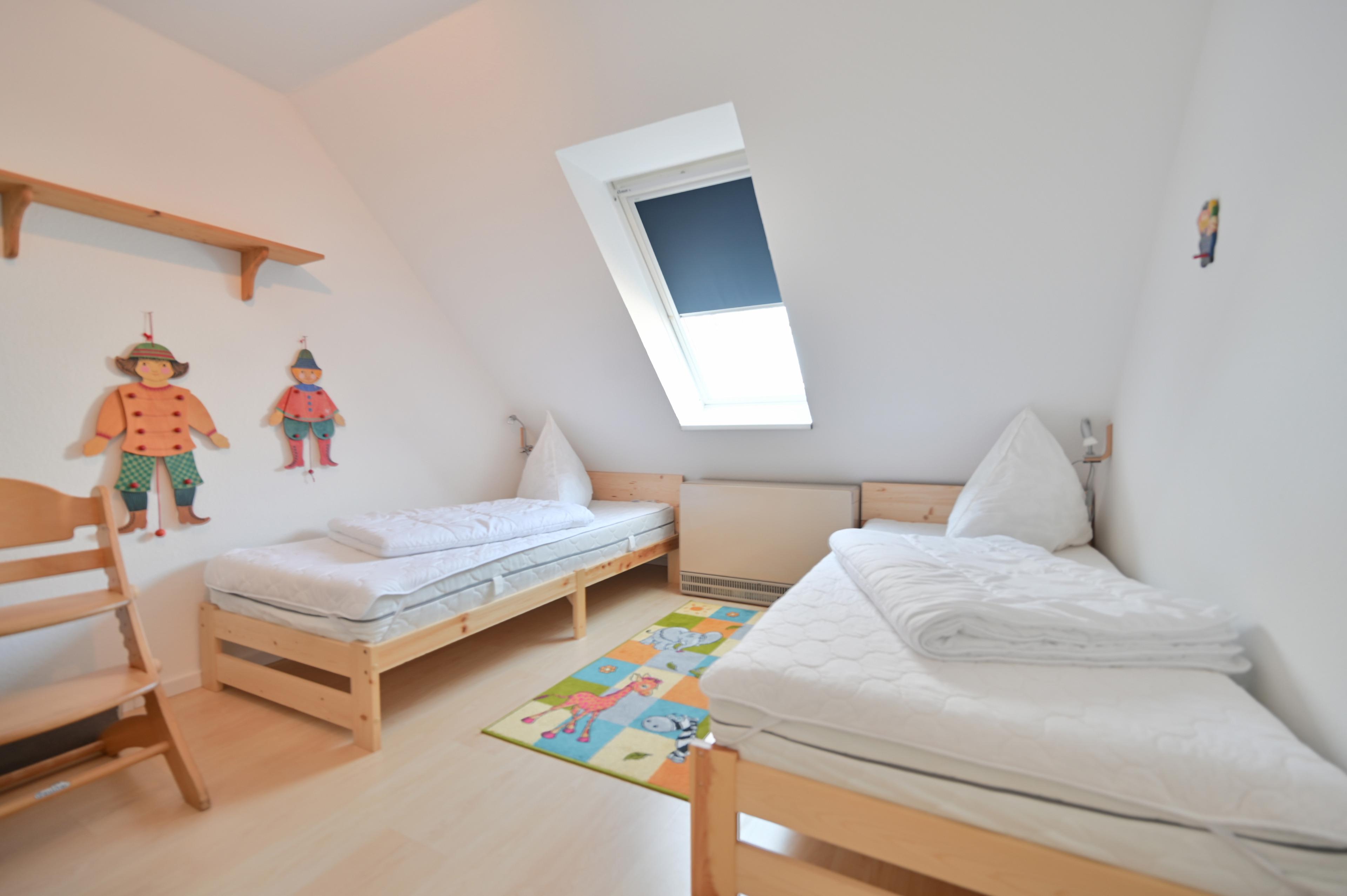 2. Schlafzimmer mit zwei einzelnstehenden Betten und Leseleuchten. Für die zwei Betten gibt es im Objekt auch Bettgitter um den Schlaf für die jüngeren Kinder angenehm zu gestalten.