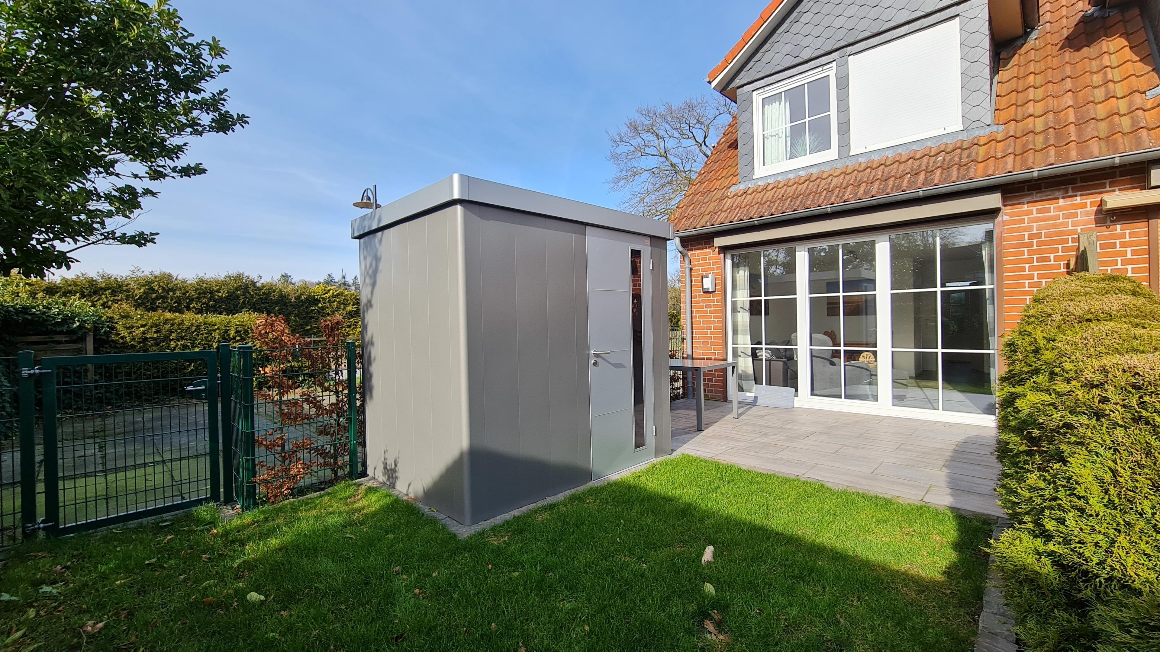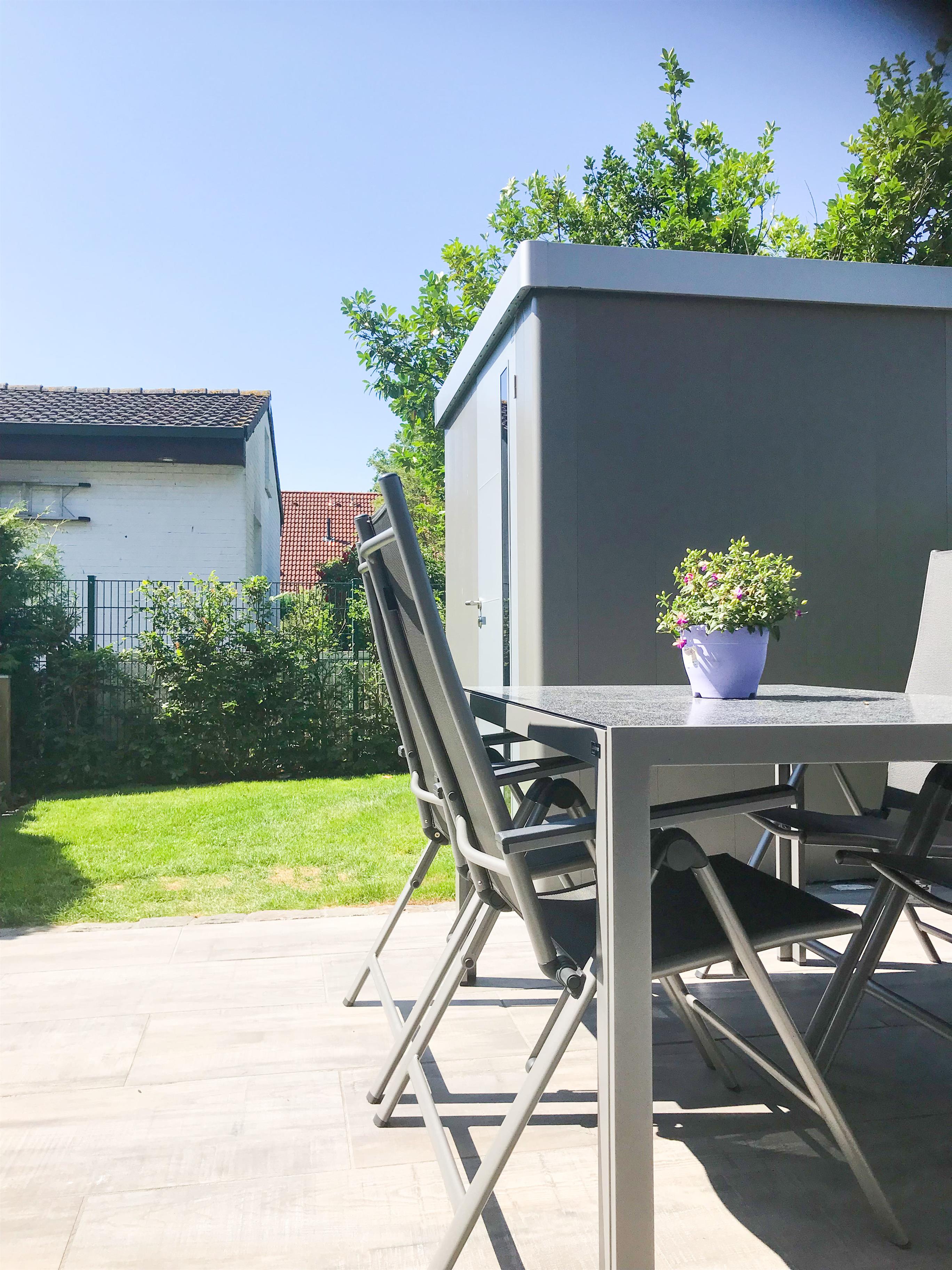 Die Gartenlaube kann 2 große und zwei Kinderfahrräder beherbergen.