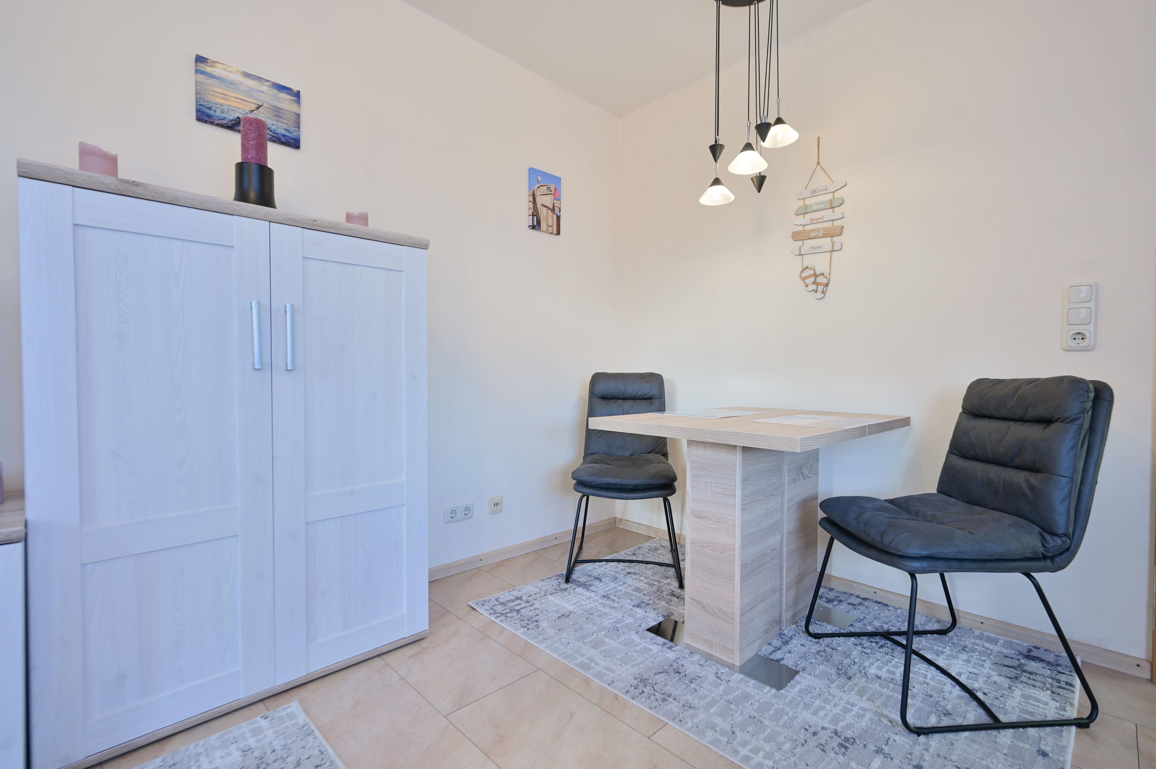 Das Wohnzimmer ist mit einem Ecksofa mit Schlaffunktion ausgestattet. Weiterhin befindet sich darin ein Esstisch mit 2 Stühlen sowie ein Fernseher und eine Musikanlage.