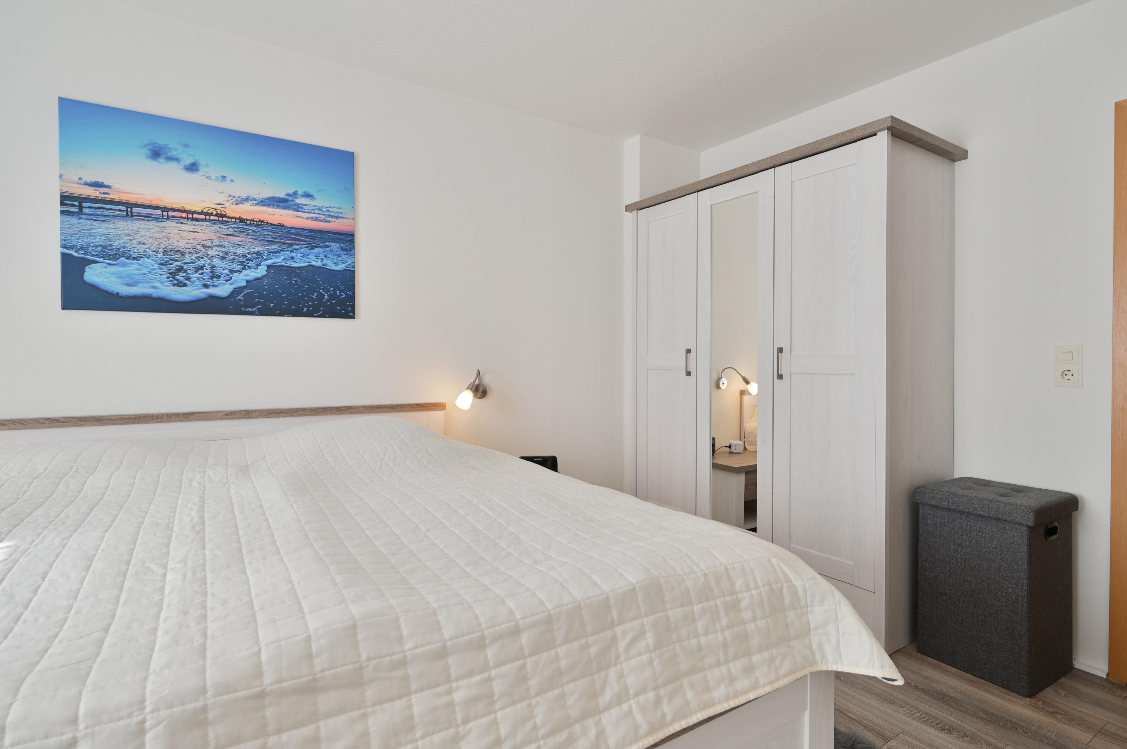 Im Schlafzimmer gibt es ein Doppelbett welches für erholsamen Schlaf sorgt, einen Schrank für die Wäsche und einen Tisch mit einem Stuhl auf dem man entspannt auch mal ein Buch lesen kann. Es verfügt außerdem über Außenrollos.