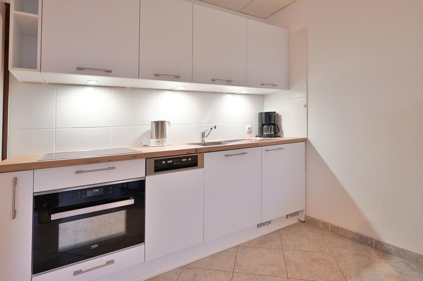 Eine gut ausgestattete Einbauküche mit Ceranfeld, Mikrowellenofen, Spülmaschine, Kaffeemaschine und Wasserkocher lädt zum kochen ein.
