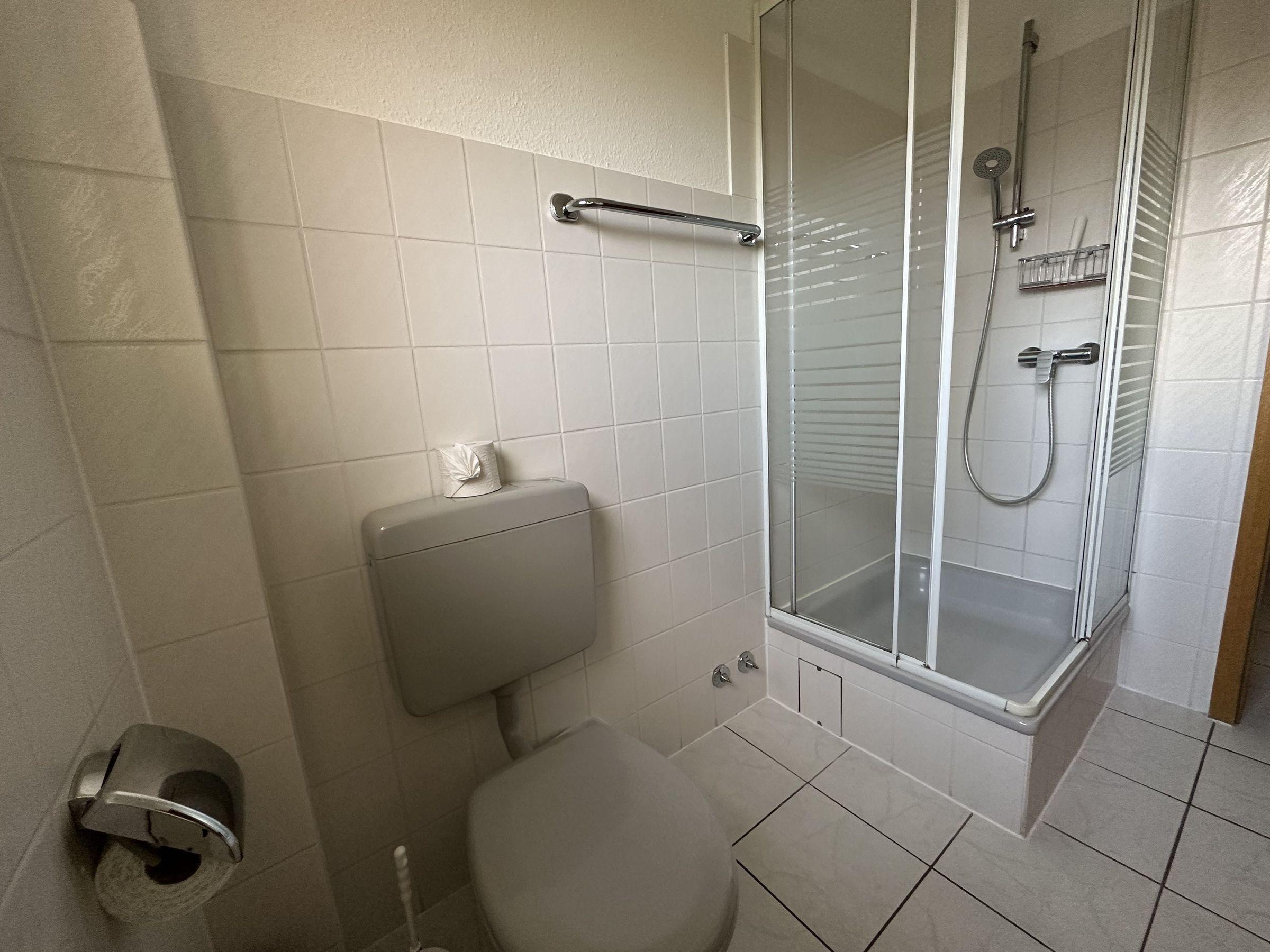 Im Badezimmer befinden sich eine Dusche und ein WC.